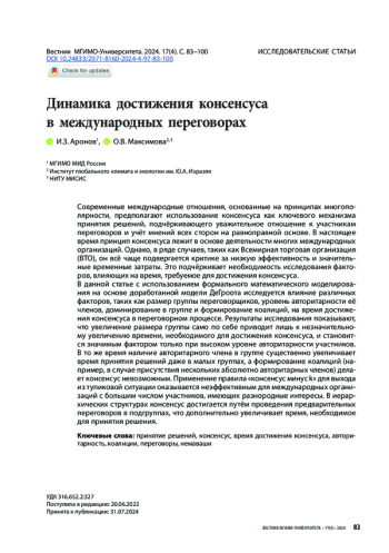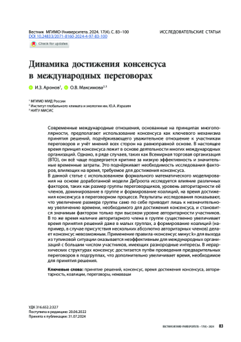 Современные международные отношения, основанные на принципах многополярности, предполагают использование консенсуса как ключевого механизма принятия решений, подчёркивающего уважительное отношение к участникам переговоров и учёт мнений всех сторон на равноправной основе. В настоящее время принцип консенсуса лежит в основе деятельности многих международных организаций. Однако, в ряде случаев, таких как Всемирная торговая организация (ВТО), он всё чаще подвергается критике за низкую эффективность и значительные временные затраты. Это подчёркивает необходимость исследования факторов, влияющих на время, требуемое для достижения консенсуса. В данной статье с использованием формального математического моделирования на основе доработанной модели ДеГроота исследуется влияние различных факторов, таких как размер группы переговорщиков, уровень авторитарности её членов, доминирование в группе и формирование коалиций, на время достижения консенсуса в переговорном процессе. Результаты исследования показывают, что увеличение размера группы само по себе приводит лишь к незначительному увеличению времени, необходимого для достижения консенсуса, и становится значимым фактором только при высоком уровне авторитарности участников. В то же время, наличие авторитарного члена в группе существенно увеличивает время принятия решений даже в малых группах, а формирование коалиций (например, в случае присутствия нескольких абсолютно авторитарных членов) делает консенсус невозможным. Применение правила «консенсус минус k» для выхода из тупиковой ситуации оказывается неэффективным для международных организаций с большим числом участников, имеющих разнородные интересы. В иерархических структурах консенсус достигается путём проведения предварительных переговоров в подгруппах, что дополнительно увеличивает время, необходимое для принятия решения.