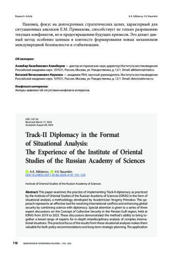В статье анализируется практика реализации дипломатии второго трека, практикуемая Институтом востоковедения Российской академии наук (ИВ РАН) в форме ситуационного анализа, методология которого была разработана академиком Е. М. Примаковым. Этот подход представляет собой эффективный инструмент урегулирования международных конфликтов и укрепления глобальной безопасности, сочетая науку и дипломатию. Особое внимание уделено серии из трёх экспертных дискуссий по Концепции коллективной безопасности в зоне Персидского залива, проведённых в ИВ РАН в 2019–2023 гг. Эти дискуссии продемонстрировали способность метода объединять широкий круг экспертов для глубокого междисциплинарного анализа сложных международных ситуаций. Практическая направленность результатов ситуационных анализов делает их полезными как для выработки политических рекомендаций, так и для долгосрочного стратегического планирования. Использование этого метода способствует формированию доверительных отношений между конфликтующими сторонами и созданию устойчивых механизмов международной безопасности. Статья также подчёркивает значение данной практики для развития российской внешнеполитической стратегии и её вклад в междисциплинарное изучение международных отношений.