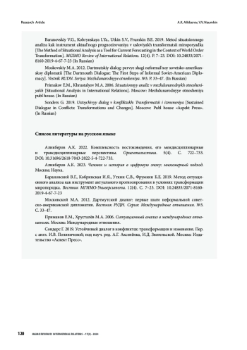 10. Барановский В.Г., Кобринская И.Я., Уткин С.В., Фрумкин Б.Е. 2019. Метод ситуационного анализа как инструмент актуального прогнозирования в условиях трансформации миропорядка. Вестник МГИМО-Университета. 12(4). С. 7-23. https://doi.org/10.24833/2071-81602019-4-67-7-23