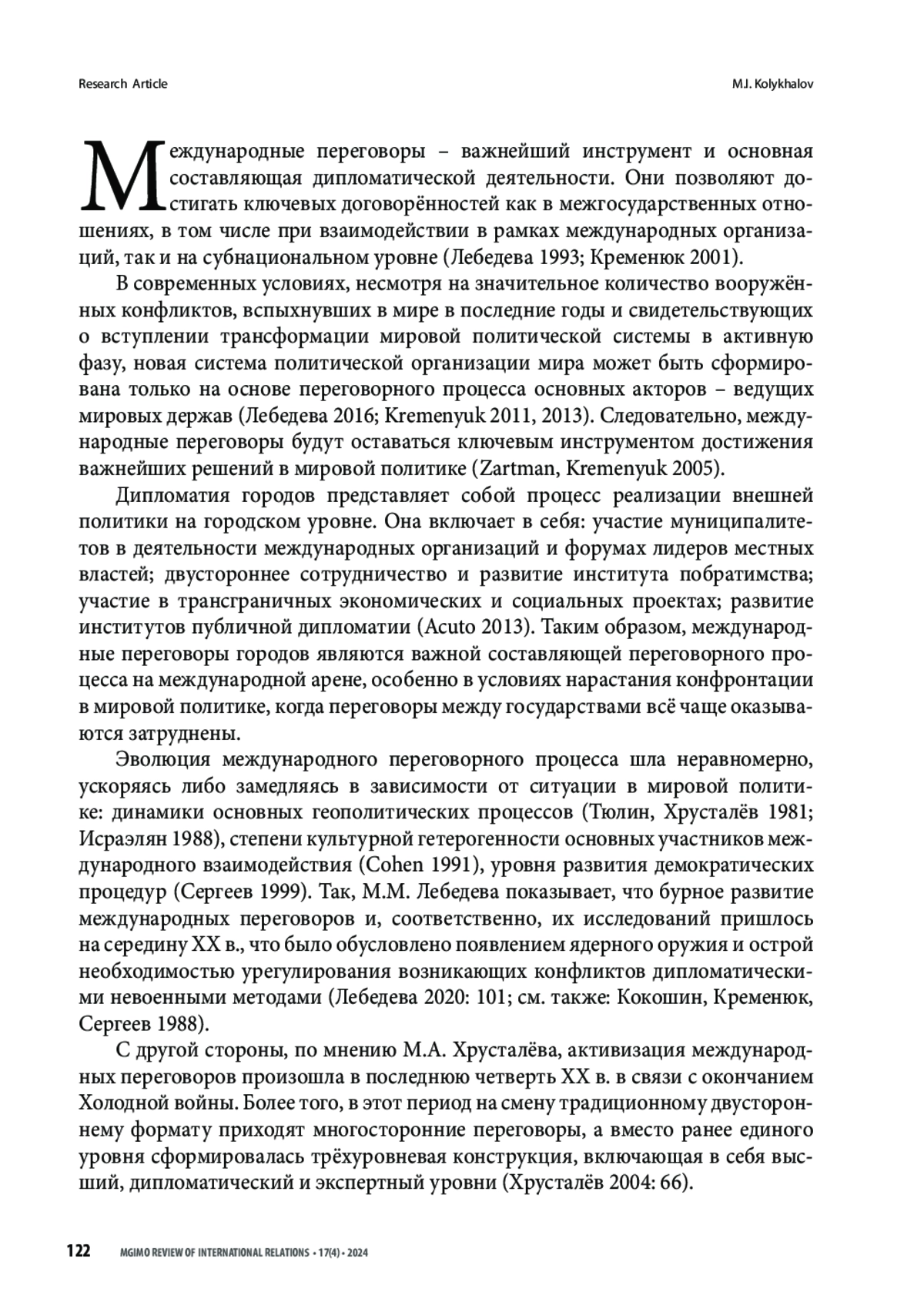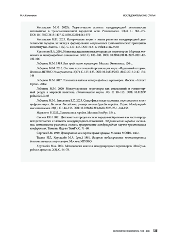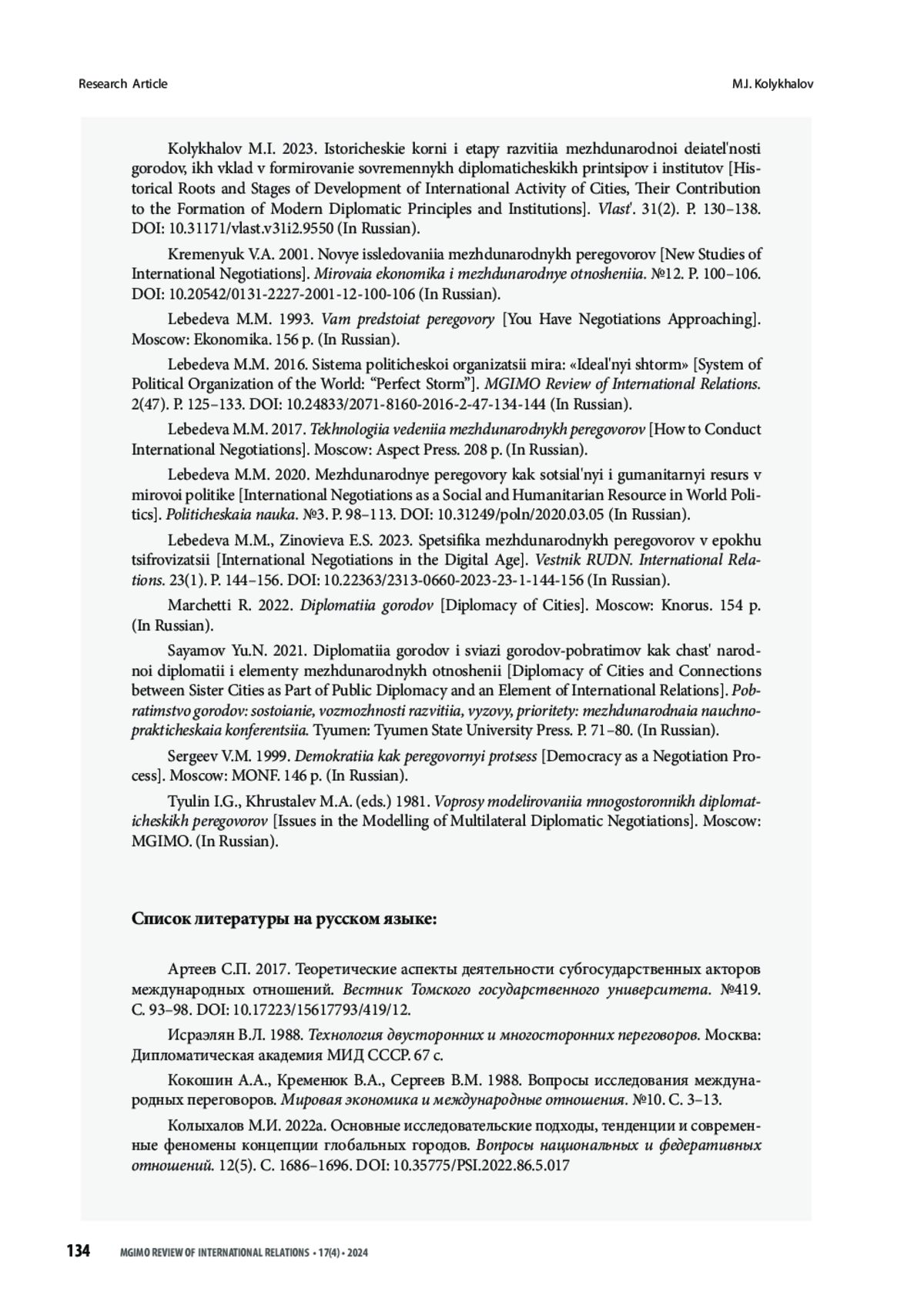 22. Лебедева М.М., Зиновьева Е.С. 2023. Специфика международных переговоров в эпоху цифровизации. Вестник Российского университета дружбы народов. Серия: Международные отношения. 23(1). C. 144-156. https://doi.org/10.22363/2313-0660-2023-23-1-144-156 Маркетти Р. 2022. Дипломатия городов. Москва: КноРус. 154 с.