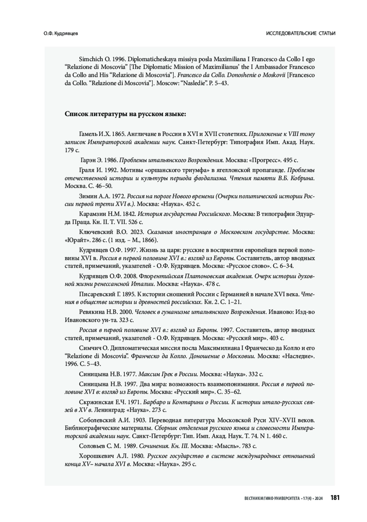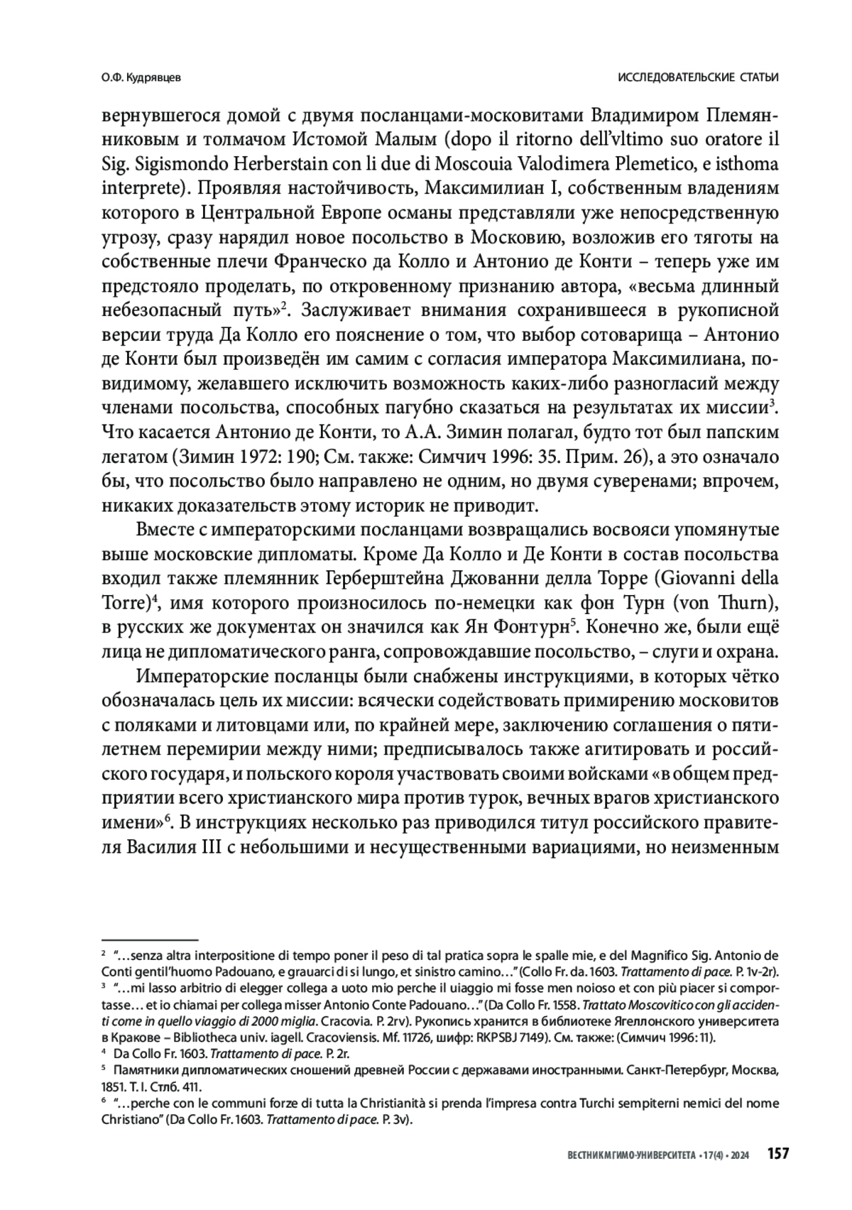 КУДРЯВЦЕВ О. Ф. НЕУДАВШЕЕСЯ МИРОТВОРЧЕСТВО: МИССИЯ ФРАНЧЕСКО ДА КОЛЛО И АНТОНИО ДЕ КОНТИ В МОСКВУ (1518–1519) // ВЕСТНИК МГИМО-УНИВЕРСИТЕТА. 2024. ТОМ 17, № 4