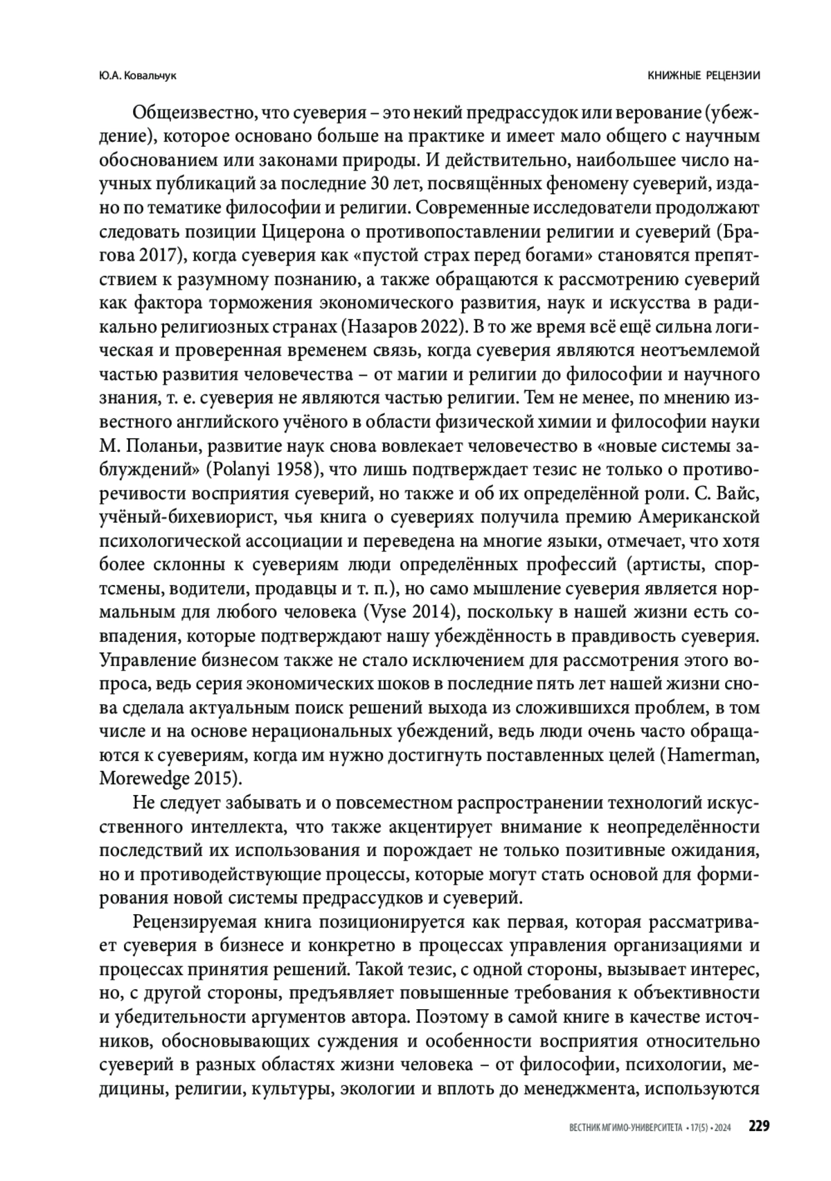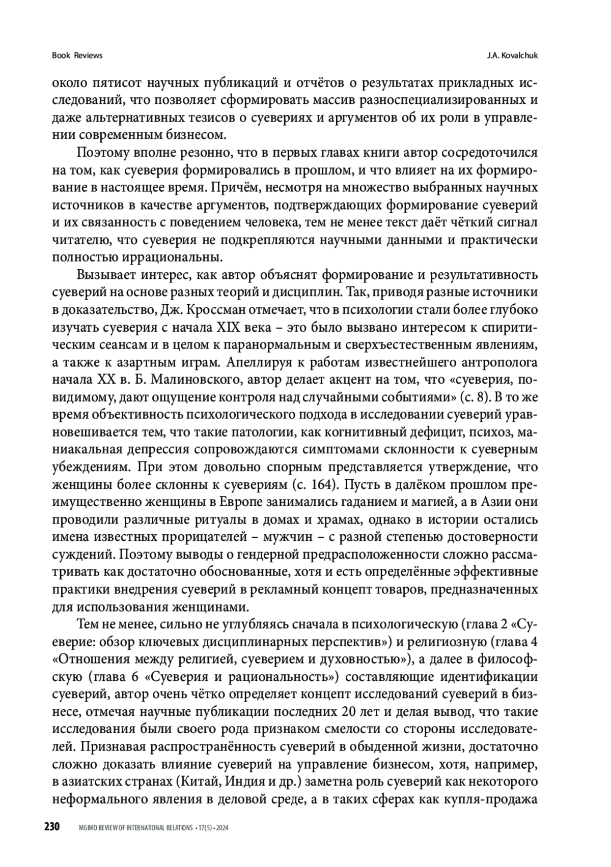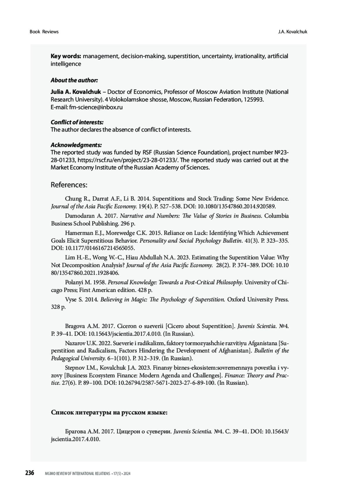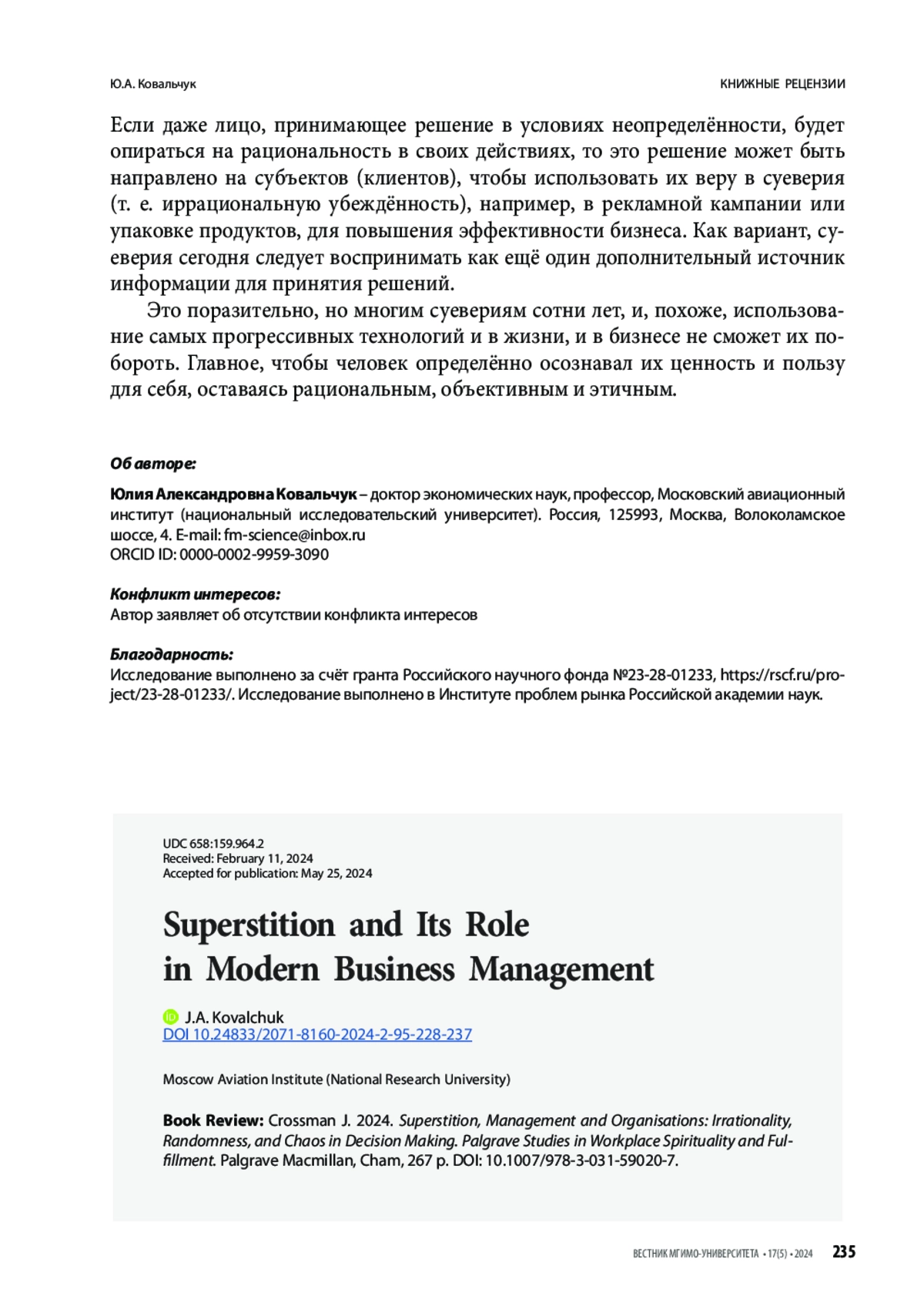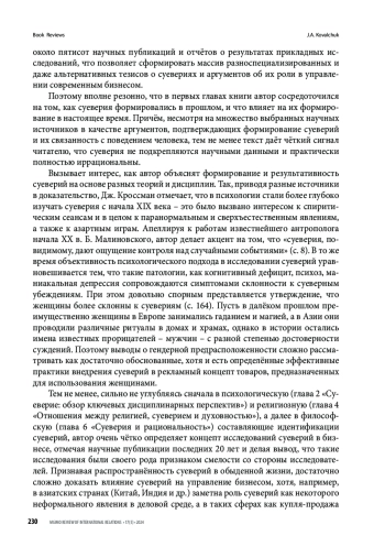 Рецензия на книгу: Crossman J. 2024. Superstition, Management and Organisations: Irrationality, Randomness, and Chaos in Decision Making. Palgrave Studies in Workplace Spirituality and Fulfillment. Palgrave Macmillan, Cham. 267 р. DOI: 10.1007/978-3-031- 59020-7.