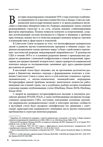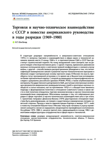 В структуре разрядки напряжённости в американо-советских отношениях 1970-х гг. вопросы торговли и взаимодействия в сфере науки и технологий занимали важное место. К концу 1960-х гг. в противостоянии США и СССР был достигнут стратегический паритет. На гонку вооружений стали смотреть как на дорогостоящее и бесперспективное дело. С одной стороны, временное равновесие военных потенциалов вело к смягчению прямой конфронтации и снижало угрозу войны, с другой – способствовало распространению убеждения в том, что интенсификация коммерческих связей и развитие научно-технологических программ и обменов создаст материальную основу прочного мира. В Москве эта мысль приобрела статус программной установки, в то время как в Вашингтоне исповедовали более прагматичный подход. С опорой на имеющееся историографическое наследие и документы российских архивов (РГАНИ, РГАЭ), а также опубликованные материалы государственного департамента США, доступные электронные коллекции документов американских разведывательных служб и некоторых научных сообществ в статье показано, как на протяжении 1970-х гг. в Вашингтоне менялись подходы к формированию политики в отношении Советского Союза и какое место в этой политике отводилось торгово-экономическому и научно-техническому взаимодействию сверхдержав. Обоснованы выводы о том, что свёртывание разрядки в сфере торговли и научно-технического взаимодействия шло в три этапа. С принятием поправки Джексона-Вэника (1974) двусторонние отношения перестали быть равноправными, не говоря о существенных коммерческих потерях советской стороны. Приход к власти администрации Картера в январе 1977 г. внёс в повестку отношений Вашингтона и Москвы тему прав человека и угрозу применения санкций в случае их нарушения, неоднократно приведённую в исполнение. На рубеже 1979–1980 гг. начался третий этап, завершивший в конце 1982 г. демонтажем инфраструктуры сотрудничества в сфере науки и технологий.