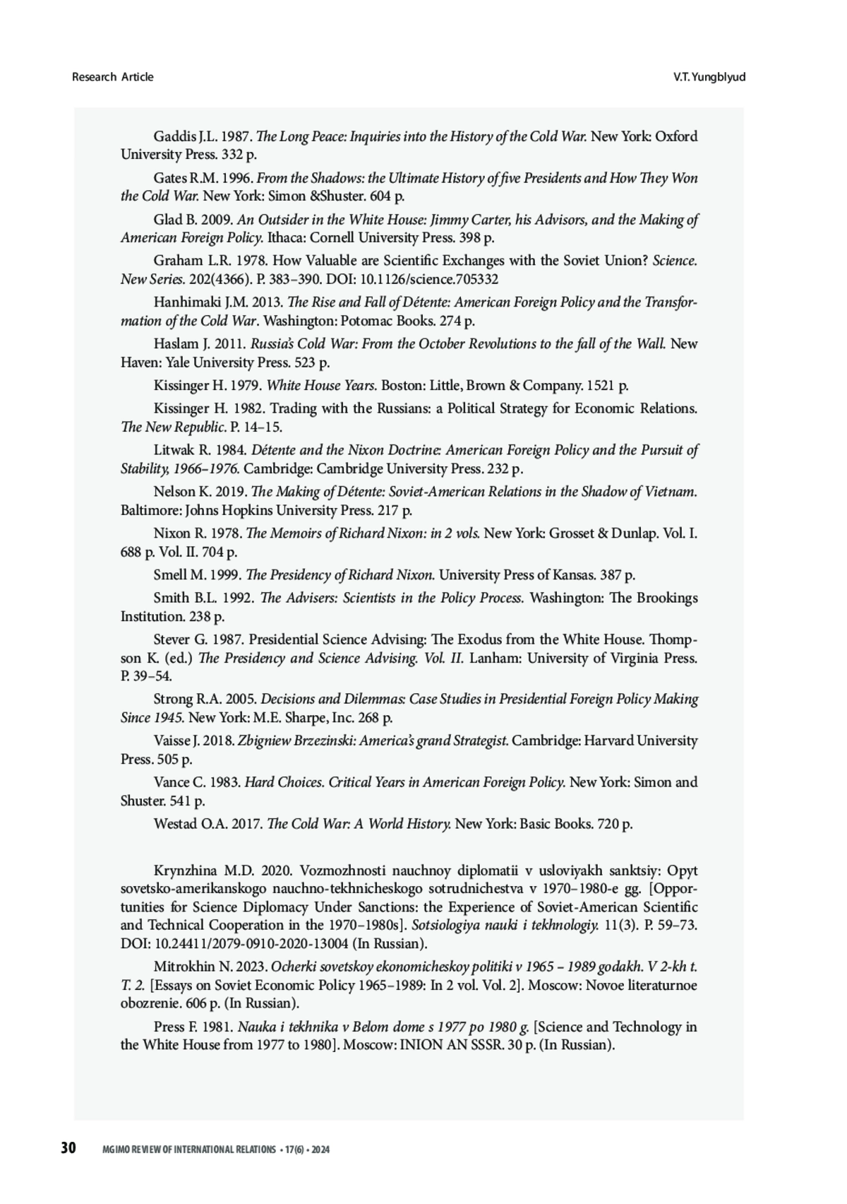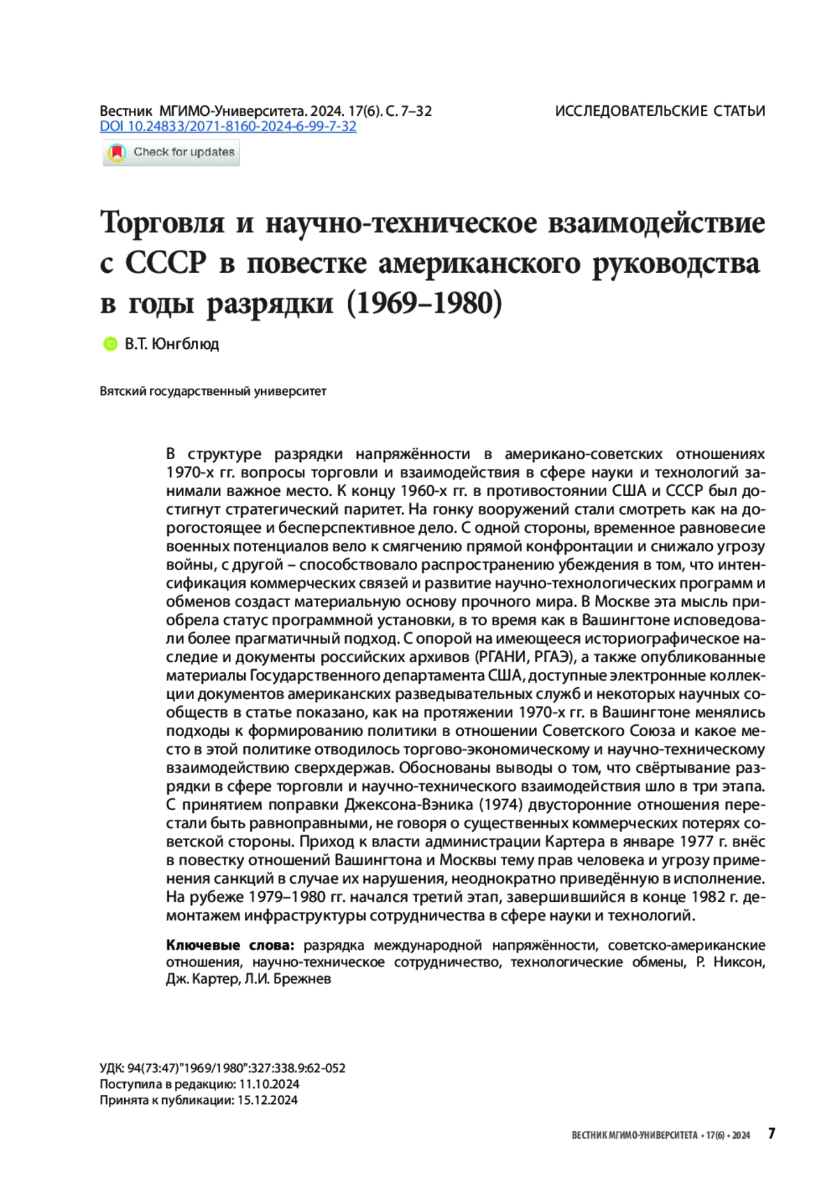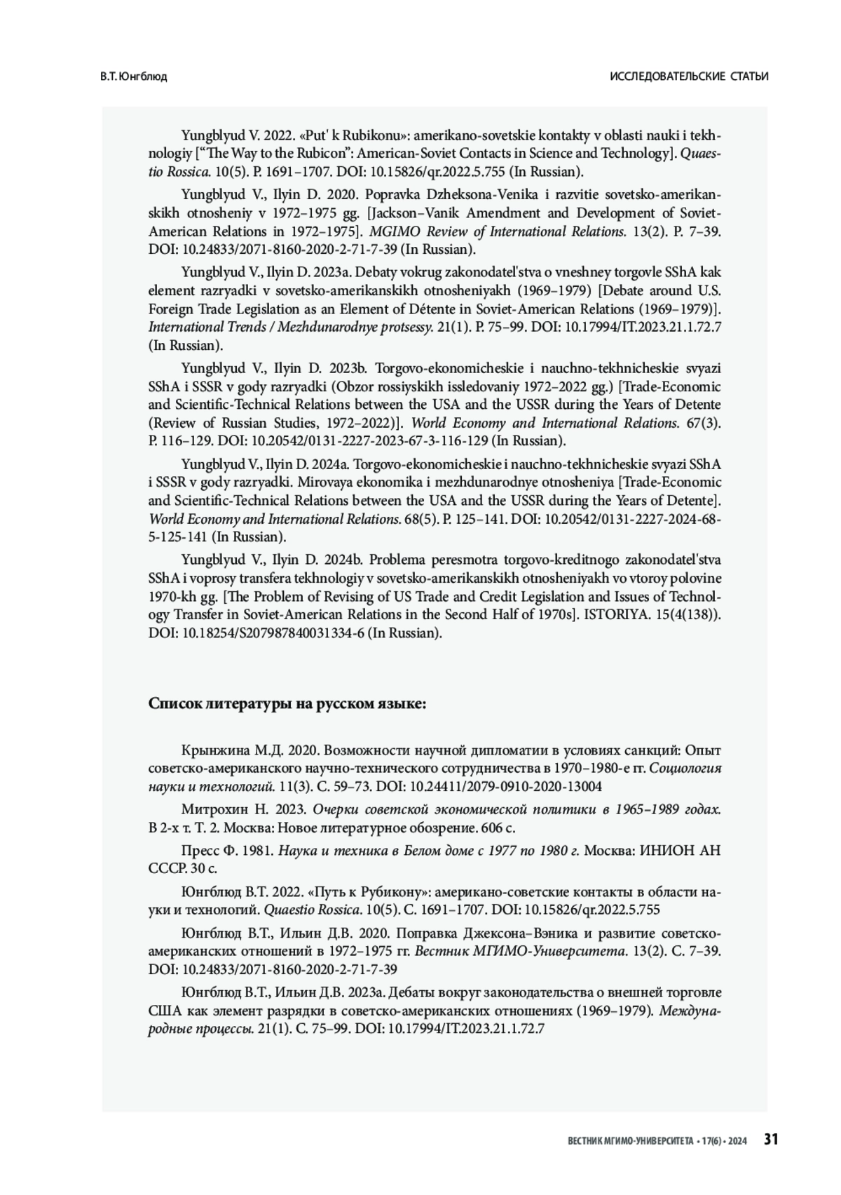 36. Юнгблюд В.Т., Ильин Д.В. 2024. Торгово-экономические и научно-технические связи США и СССР в годы разрядки. Мировая экономика и международные отношения. Т. 68. № 5. С. 125-141. https://doi.org/10.20542/0131-2227-2024-68-5-125-141