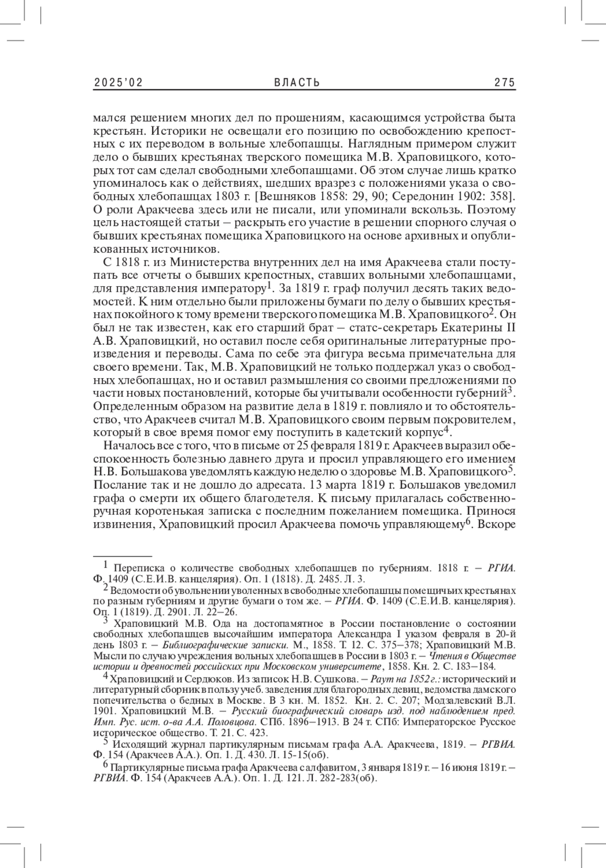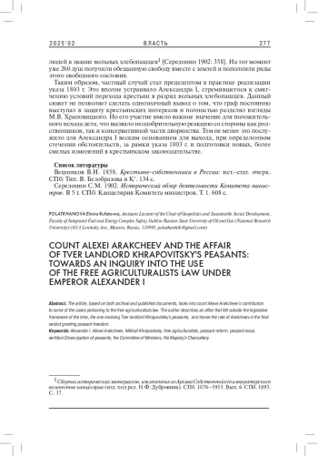 В статье на основе архивных и опубликованных источников рассмотрено участие А. А. Аракчеева в решении дел, касающихся практики освобождения крестьян в вольные хлебопашцы, на примере крестьян тверского помещика М. В. Храповицкого. Автор освещает роль А. А. Аракчеева в решении этого дела, выходящего за рамки основных положений указа 1803 г.