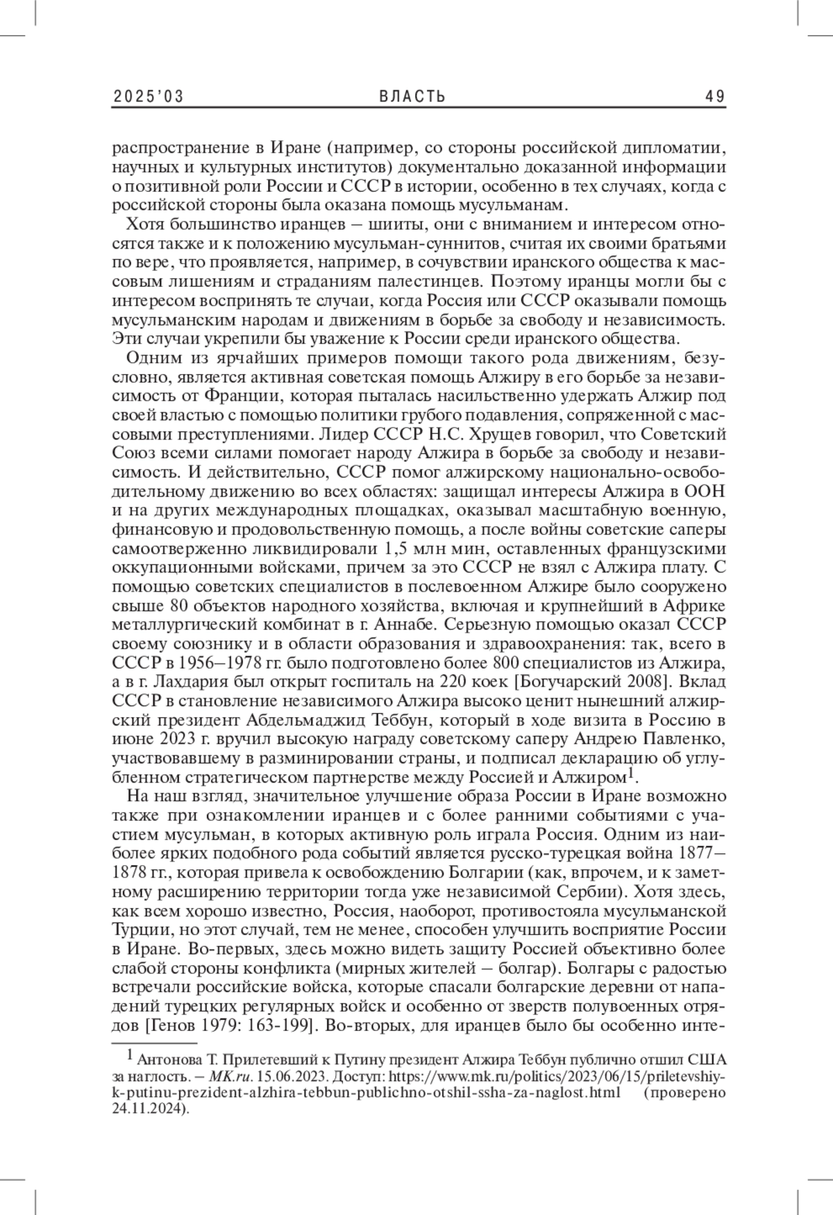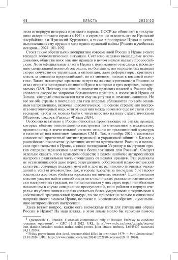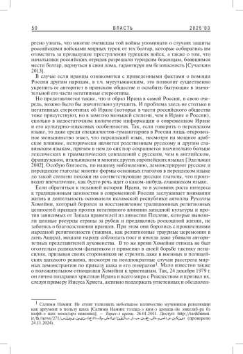 ХОДУНОВ А. С. ОСОБЕННОСТИ ОБРАЗА РОССИИ В СОВРЕМЕННОМ ИРАНЕ: ИСТОРИЧЕСКИЕ ПРЕДПОСЫЛКИ ФОРМИРОВАНИЯ И СОВРЕМЕННОЕ СОСТОЯНИЕ // ВЛАСТЬ. 2025. ТОМ 33 № 3