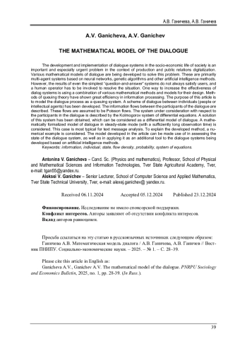 ГАНИЧЕВА А. В., ГАНИЧЕВ А. В. МАТЕМАТИЧЕСКАЯ МОДЕЛЬ ДИАЛОГА // ВЕСТНИК ПЕРМСКОГО НАЦИОНАЛЬНОГО ИССЛЕДОВАТЕЛЬСКОГО ПОЛИТЕХНИЧЕСКОГО УНИВЕРСИТЕТА. СОЦИАЛЬНО-ЭКОНОМИЧЕСКИЕ НАУКИ. 2025. № 1