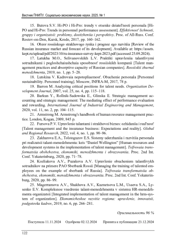 ЕРУСЛАНКИНА П. В. СОСТОЯНИЕ СИСТЕМЫ УПРАВЛЕНИЯ ТАЛАНТАМИ В КРУПНЫХ СТРАХОВЫХ КОМПАНИЯХ РОССИИ // ВЕСТНИК ПЕРМСКОГО НАЦИОНАЛЬНОГО ИССЛЕДОВАТЕЛЬСКОГО ПОЛИТЕХНИЧЕСКОГО УНИВЕРСИТЕТА. СОЦИАЛЬНО-ЭКОНОМИЧЕСКИЕ НАУКИ. 2025. № 1