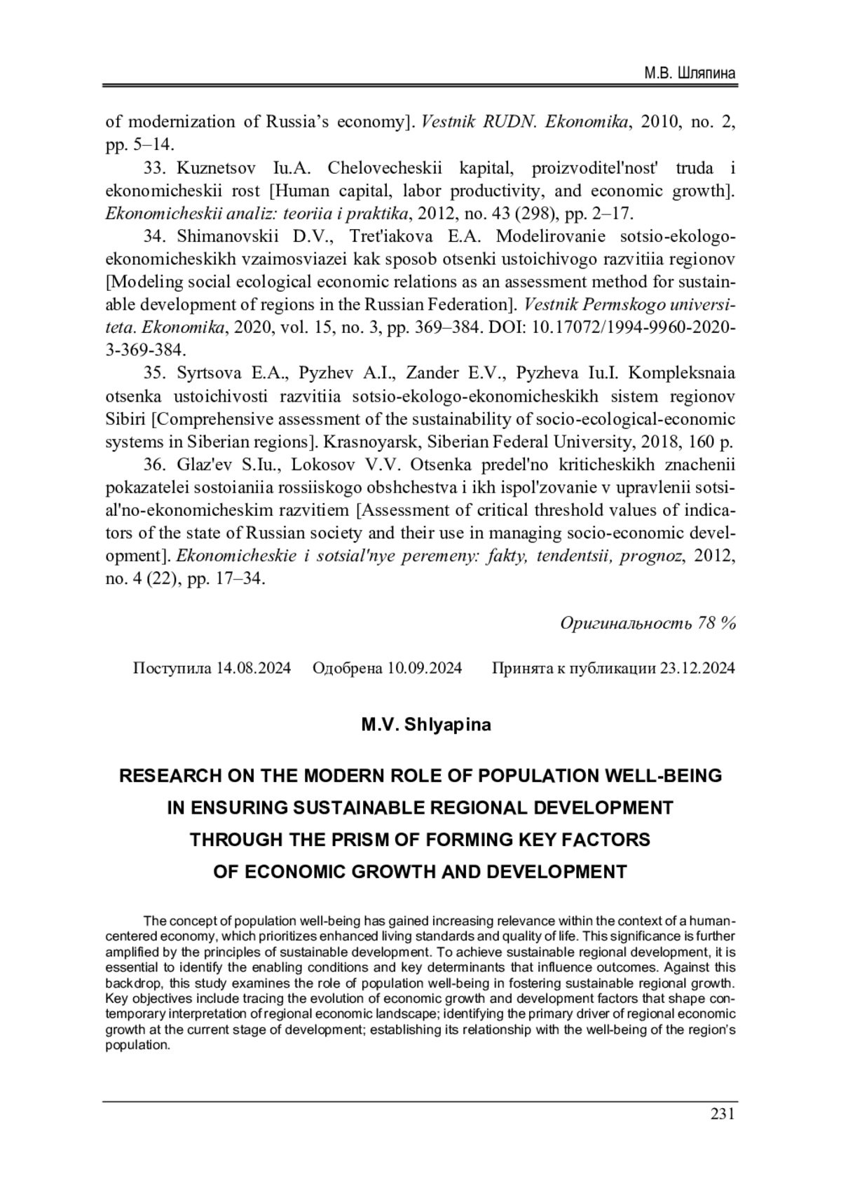 1. Шляпина, М.В. Эволюция категории “благосостояние”: от человекоутилизирующей до человекоориентированной парадигмы / М.В. Шляпина // Вестник Пермского национального исследовательского политехнического университета. Социально-экономические науки. - 2022. - № 4. - С. 359-376. DOI: 10.15593/2224-9354/2022.4.24