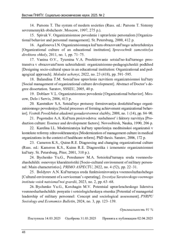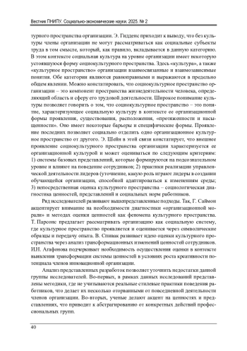 БЫЧЕНКО Ю. Г. К ВОПРОСУ О СОЦИОЛОГИЧЕСКОЙ ОЦЕНКЕ СОЦИОКУЛЬТУРНОГО ПРОСТРАНСТВА СОВРЕМЕННОЙ ОРГАНИЗАЦИИ // ВЕСТНИК ПЕРМСКОГО НАЦИОНАЛЬНОГО ИССЛЕДОВАТЕЛЬСКОГО ПОЛИТЕХНИЧЕСКОГО УНИВЕРСИТЕТА. СОЦИАЛЬНО-ЭКОНОМИЧЕСКИЕ НАУКИ. 2025. № 2