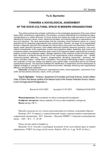 Статья: К ВОПРОСУ О СОЦИОЛОГИЧЕСКОЙ ОЦЕНКЕ СОЦИОКУЛЬТУРНОГО ПРОСТРАНСТВА СОВРЕМЕННОЙ ОРГАНИЗАЦИИ (2025)