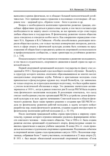 Рассмотрены особенности управленческой деятельности в студенческих спортивных клубах (СКК). Актуальность проблемы обусловлена заметно возросшей в последние несколько лет ролью СКК в деле эффективного развития общества и вовлечения в активные жизненные процессы молодежи, получающей образование в высших и профессиональных учебных заведениях России. Для устойчивого и эффективного функционирования любой структуры, в том числе и СКК, важным фактором является совершенствование методов управления клубом. Целью работы является анализ особенностей развития студенческого спорта в современной России в исторической параллели с опытом возникновения студенческих спортивных организаций в СССР в 20-30-х гг. ХХ в., рассмотрение факторов, влияющих на развитие студенческого спорта, методов управления ССК, а также изучение недостатков в этой сфере. Анализируется нормативно-правовая база, регулирующая вопросы функционирования ССК на государственном уровне. На основе исследования опубликованных в научных журналах и ЭСМИ материалов авторы выделяют шесть особенностей, отличающих работу именно студенческих спортивных клубов от региональных спортивных организаций или спортивных клубов при промышленных предприятиях. Отдельно подчеркивается важность работы студента в качестве функционера в структуре ССК, где молодой человек получает практический опыт управленческой деятельности, крайне необходимый в дальнейшей профессиональной деятельности. Авторами вводится в оборот термин «самоактуализация» в узком смысле, под которой понимается процесс самоопределения молодого человека в обществе, его успешной социализации и адаптации к условиям, в которые он поставлен в процессе обучения в высшем учебном заведении.