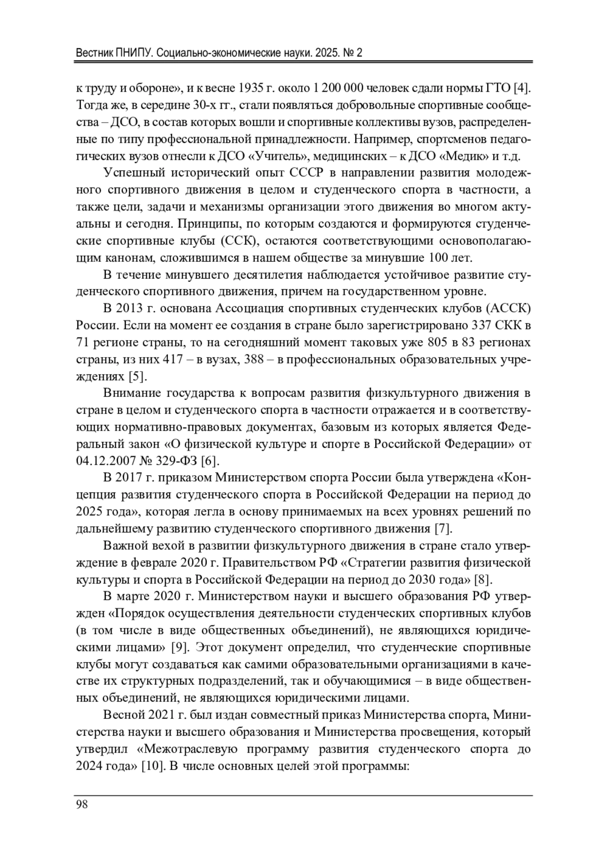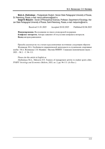 ЖЕЛИНСКАЯ М. А., МАЛЯВИН С. Н. ОСОБЕННОСТИ УПРАВЛЕНЧЕСКОЙ ДЕЯТЕЛЬНОСТИ В СТУДЕНЧЕСКИХ СПОРТИВНЫХ КЛУБАХ // ВЕСТНИК ПЕРМСКОГО НАЦИОНАЛЬНОГО ИССЛЕДОВАТЕЛЬСКОГО ПОЛИТЕХНИЧЕСКОГО УНИВЕРСИТЕТА. СОЦИАЛЬНО-ЭКОНОМИЧЕСКИЕ НАУКИ. 2025. № 2