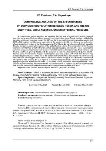 В современной мировой политике санкции становятся основным рычагом давления на наиболее значимые страны и объединения. Ведя суверенную и независимую политику, Россия попала под санкции со стороны западных стран, а именно США и ЕС. В отличие от относительно точечных санкций 2014 г., направленных против отдельных лиц и организаций, санкции 2022 г. приобрели всеобъемлющий характер, затрагивая практически все секторы российской экономики. Рынки США и ЕС были окончательно закрыты для российских компаний, поэтому приоритетом стали рынки глобального Юга. Вопросам переориентации российской экономики с запада на юг и восток уделяется все больше внимания. В представленной работе рассматривается динамика экспорта, импорта и товарооборота по странам СНГ, Китаю и Индии. Отмечается устойчивый рост товарооборота со странами СНГ, за исключением Молдовы, которая придерживается антироссийской политики. Китай остается ключевым экономическим партнером России, с которым товарооборот значительно вырос после 2022 г., что связано с переориентацией на азиатские рынки и вводом в эксплуатацию «Силы Сибири». Товарооборот с Индией резко увеличился в 2022 г., что обусловлено перенаправлением экспорта нефти в Индию после отказа ЕС от российских энергоресурсов. Был выделен ряд проблем: политические разногласия с некоторыми странами СНГ, культурные различия и конкуренция с Китаем, низкий уровень импорта из Индии. В качестве рекомендаций предлагается создание «нефтерубля», развитие собственной финансовой инфраструктуры, наращивание импорта фармацевтической продукции из Индии.