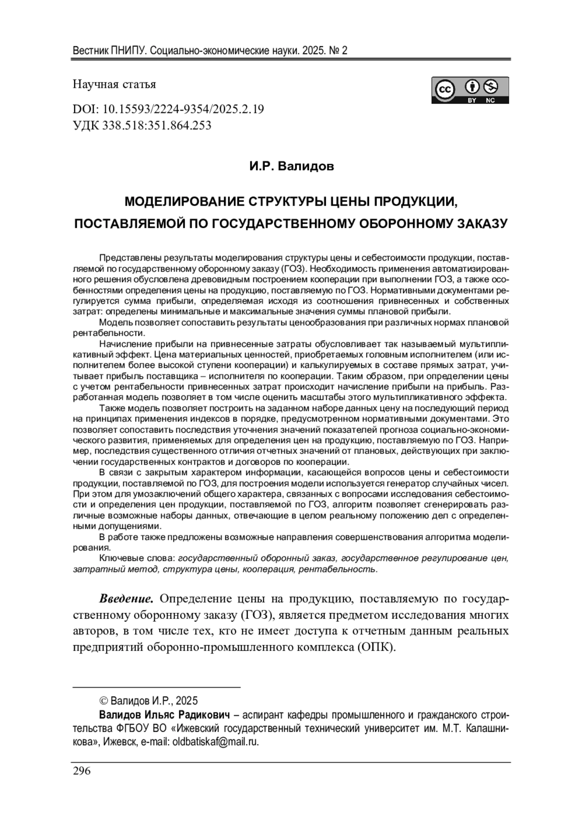 ВАЛИДОВ И. Р. МОДЕЛИРОВАНИЕ СТРУКТУРЫ ЦЕНЫ ПРОДУКЦИИ, ПОСТАВЛЯЕМОЙ ПО ГОСУДАРСТВЕННОМУ ОБОРОННОМУ ЗАКАЗУ // ВЕСТНИК ПЕРМСКОГО НАЦИОНАЛЬНОГО ИССЛЕДОВАТЕЛЬСКОГО ПОЛИТЕХНИЧЕСКОГО УНИВЕРСИТЕТА. СОЦИАЛЬНО-ЭКОНОМИЧЕСКИЕ НАУКИ. 2025. № 2