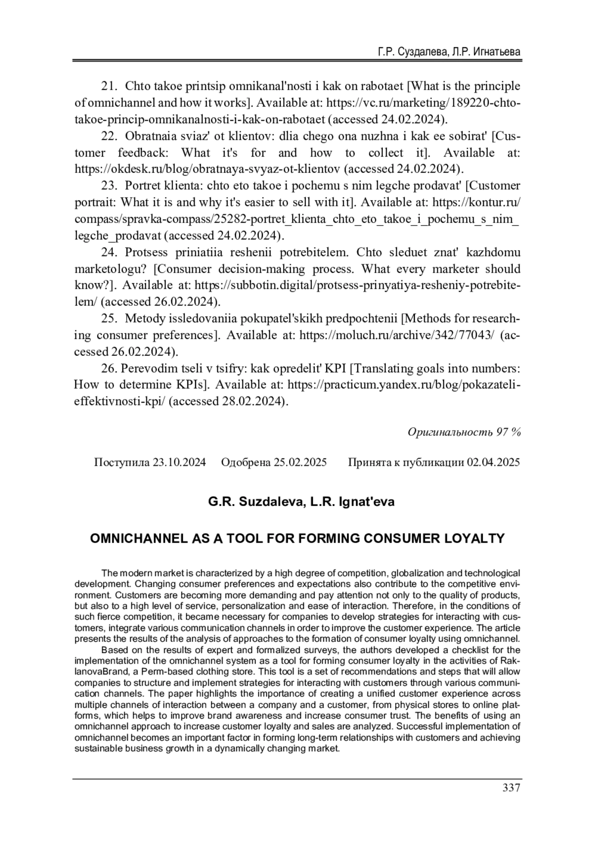 1. Малайчук, О.А. Трансформация маркетинговой модели в сторону омниканальности / О.А. Малайчук // Мировая экономика и бизнес-администрирование: сб. науч. тр. - М.: Четыре четверти, 2022. - С. 188-190. EDN: KGPVRU