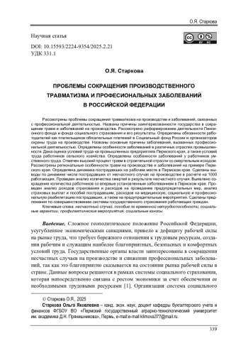 Введение. Сложное геополитическое положение Российской Федерации, усугубленное экономическими санкциями, привело к дефициту рабочей силы на рынке труда, что требует бережного отношения к трудовым ресурсам, создания рабочим и служащим наиболее благоприятных, безопасных и комфортных условий труда. Государственные органы власти заинтересованы в сокращении несчастных случаев на производстве и снижении профессиональных заболеваний, так как это благоприятно сказывается на состоянии рынка рабочей силы в стране. Данные вопросы решаются в рамках системы социального страхования, которая непосредственно связана с ростом экономики за счет обеспечения ее необходимыми трудовыми ресурсами