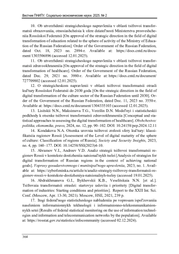 15. Абрамов, В.И. Анализ стратегий цифровой трансформации регионов России в контексте достижения национальных целей [Электронный ресурс] / В.И. Абрамов, В.Д. Андреев // Вопросы государственного и муниципального управления. - 2023. - № 1. - URL: https://cyberleninka.ru/article/n/analiz-strategiy-tsifrovoy-transformatsii-regionov-rossii-v-kontekste-dostizheniya-natsionalnyh-tseley (дата обращения: 19.01.2025). EDN: JOKUIR