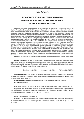 Цифровая трансформация отраслей социальной сферы объявлена одной из национальных целей Российской Федерации. С учетом того, что ее целями декларируется как преобразование основных отраслей экономики и социальной сферы, так и обеспечение устойчивого роста качества жизни жителей, данное направление исследований является актуальным для северных территорий страны. Целью настоящего исследования является анализ ключевых аспектов цифровой трансформации отраслей здравоохранения, образования и культуры. В качестве объекта исследования выбрана цифровизация отраслей здравоохранения, образования и культуры в регионах Севера России, территория которых полностью относится к Крайнему Северу и приравненным к нему местностям. В статье анализируются особенности цифровизации отраслей социальной сферы регионов Севера и в частности Республики Коми за период 2014-2023 гг. Рассчитан интегральный индекс цифровизации регионов Севера России за период 2022-2023 гг., состоящий из четырех подиндексов. Расчет индекса цифровизации был произведен с применением методов нормирования данных для их соизмеримости. Проведено ранжирование регионов Севера России по уровню цифровизации в 2023 г. Выявлена недостаточная цифровизация инфраструктуры регионов и техническая обеспеченность учреждений данных отраслей и населения, что в совокупности приводит к цифровому неравенству в городской и сельской местности. Значимость исследования с практической точки зрения состоит в том, что его результаты можно использовать для оценки результативности цифровизации регионов. Для более глубокого изучения процесса цифровизации социальной сферы регионов Севера России в дальнейшем планируется проанализировать его особенности на муниципальном уровне.