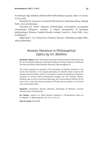 В статье рассматривается специфика восприятия русской литературы в творчестве В. В. Бибихина. В своей оригинальной философии В. В. Бибихин нередко обращался к русской литературной традиции, которая для него почти так же значима, как западноевропейская или древнегреческая философская мысль. Русская классическая литература была для него носителем универсальных смыслов, а не локальной национальной традицией. В то же время именно здесь наиболее остро был поставлен вопрос о России и ее положении в мире.