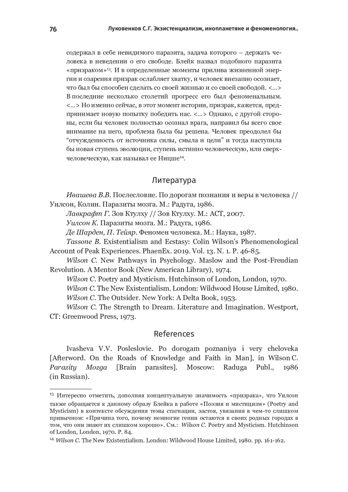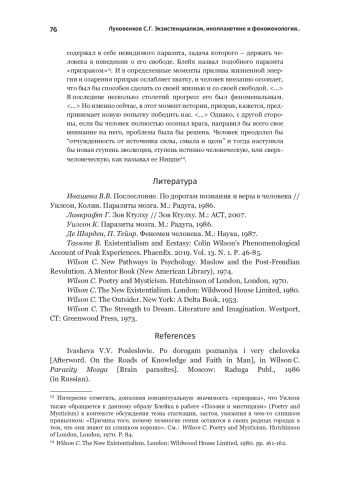 5. Tassone B. Existentialism and Ecstasy: Colin Wilson’s Phenomenological Account of Peak Experiences. PhaenEx. 2019. Vol. 13. N. 1. P. 46-85.