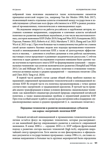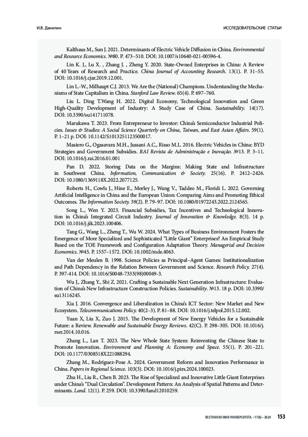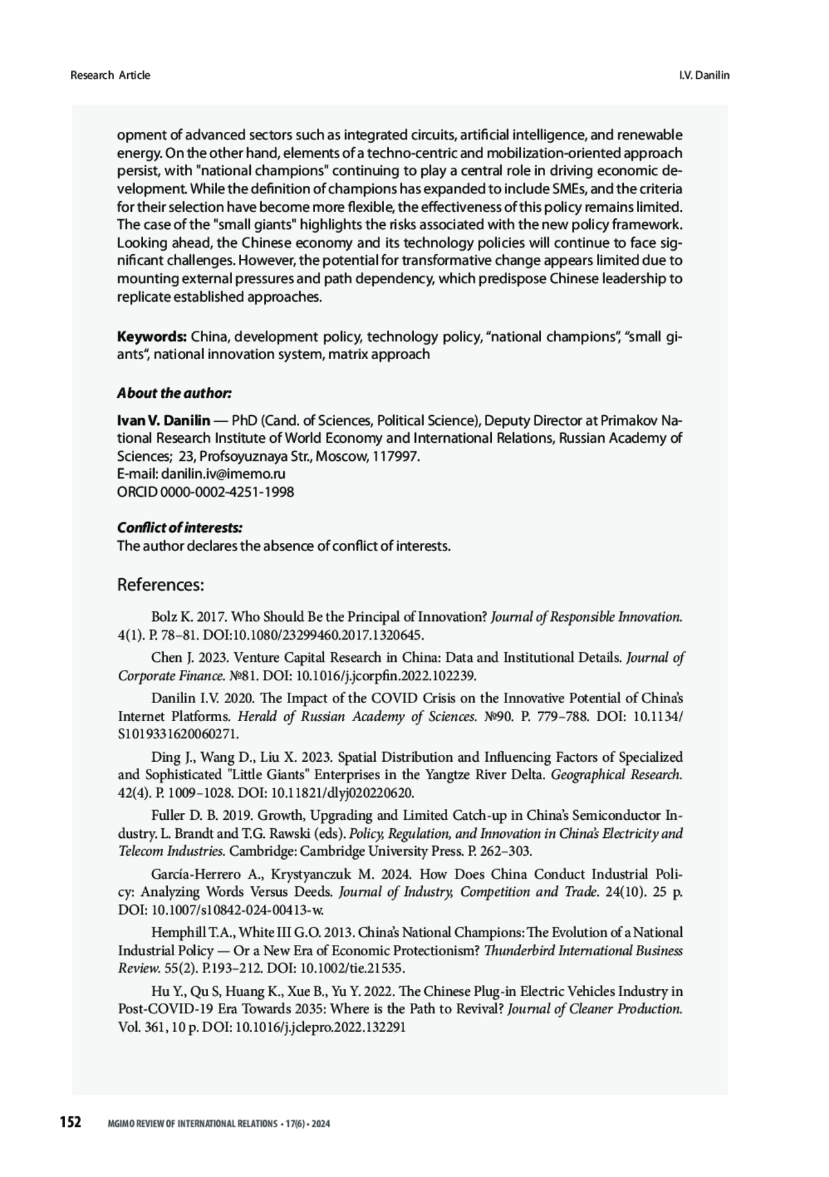 ДАНИЛИН И. В. «НАЦИОНАЛЬНЫЕ ЧЕМПИОНЫ» И ТЕХНОЛОГИЧЕСКИЕ «МАЛЕНЬКИЕ ГИГАНТЫ»: КИТАЙСКАЯ ПРОМЫШЛЕННАЯ ПОЛИТИКА МЕЖДУ МОДЕРНИЗАЦИЕЙ И ТРАДИЦИЕЙ // ВЕСТНИК МГИМО-УНИВЕРСИТЕТА. 2024. ТОМ 17, № 6