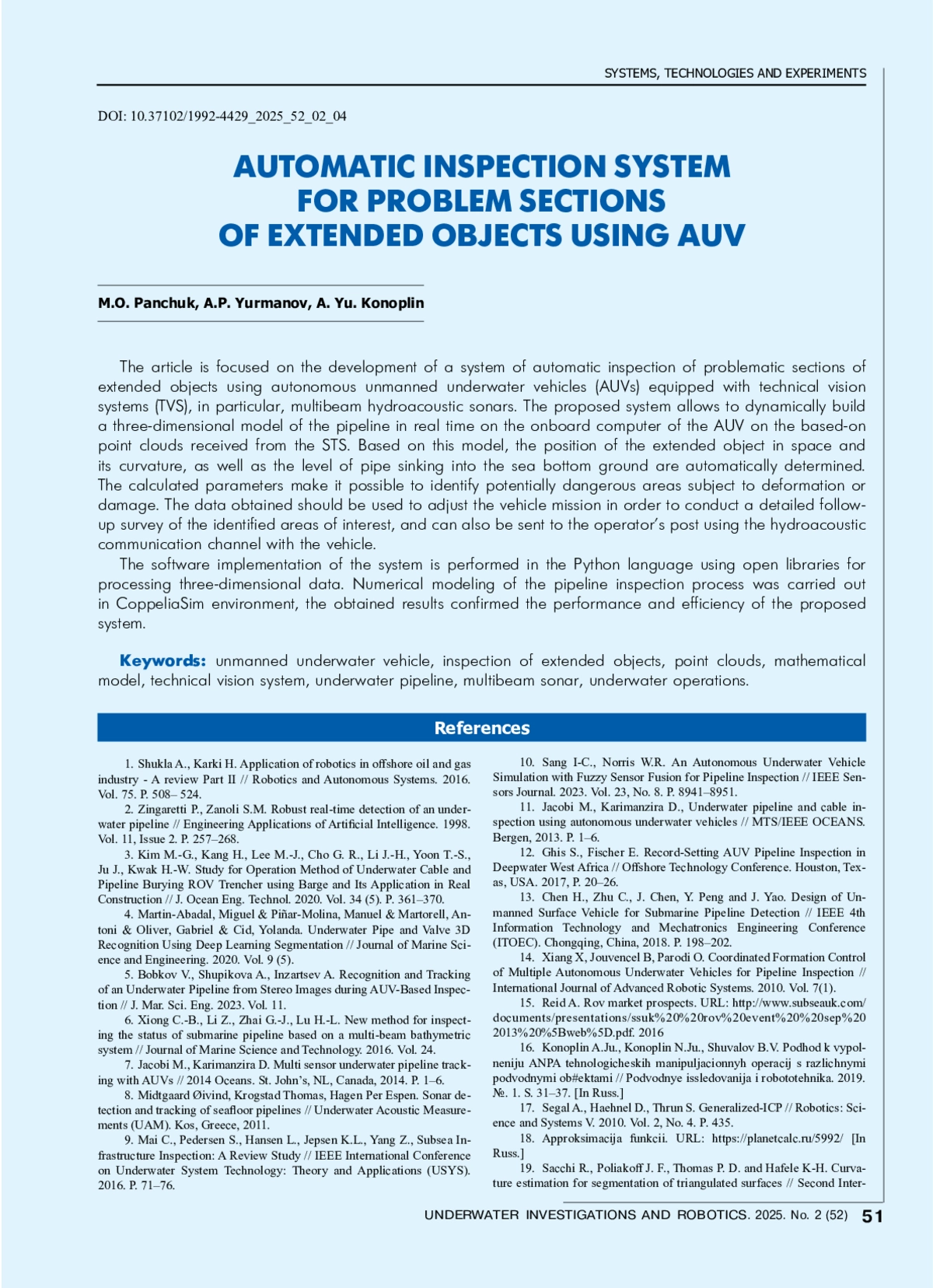 25. Zingaretti P., Zanoli S.M. Robust real-time detection of an underwater pipeline // Engineering Applications of Artificial Intelligence. 1998. Vol. 11, Issue 2. P. 257-268.