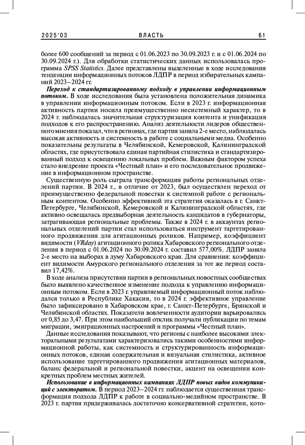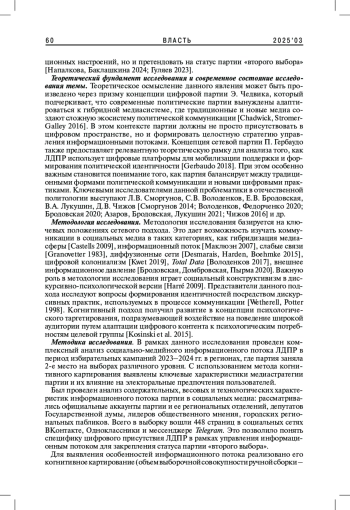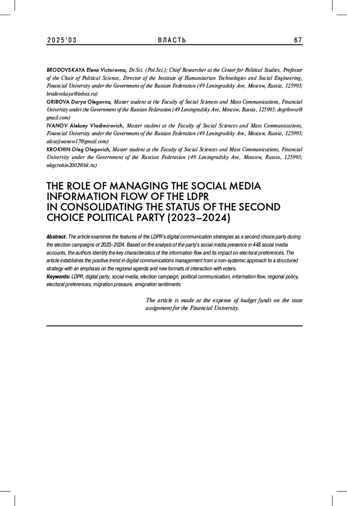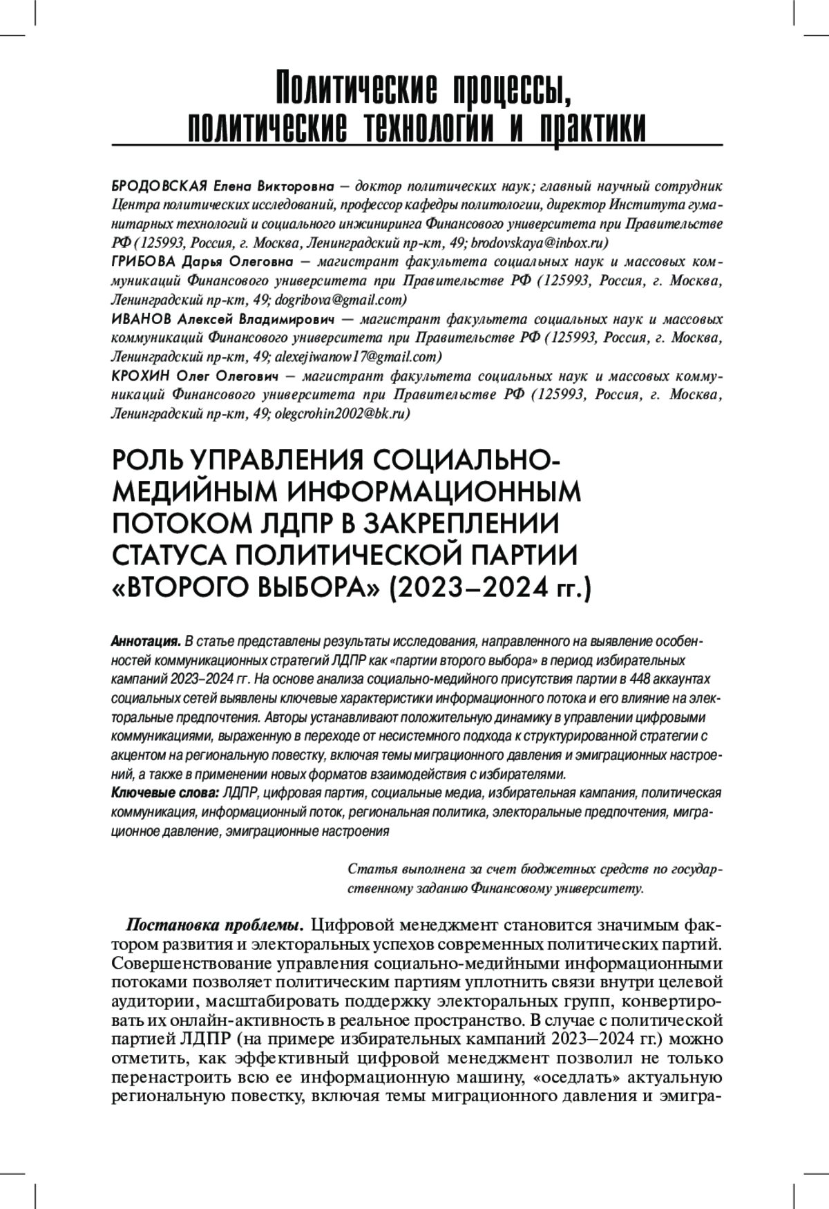 В статье представлены результаты исследования, направленного на выявление особенностей коммуникационных стратегий ЛДПР как «партии второго выбора» в период избирательных кампаний 2023-2024 гг. На основе анализа социально-медийного присутствия партии в 448 аккаунтах социальных сетей выявлены ключевые характеристики информационного потока и его влияние на электоральные предпочтения. Авторы устанавливают положительную динамику в управлении цифровыми коммуникациями, выраженную в переходе от несистемного подхода к структурированной стратегии с акцентом на региональную повестку, включая темы миграционного давления и эмиграционных настроений, а также в применении новых форматов взаимодействия с избирателями.