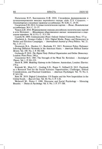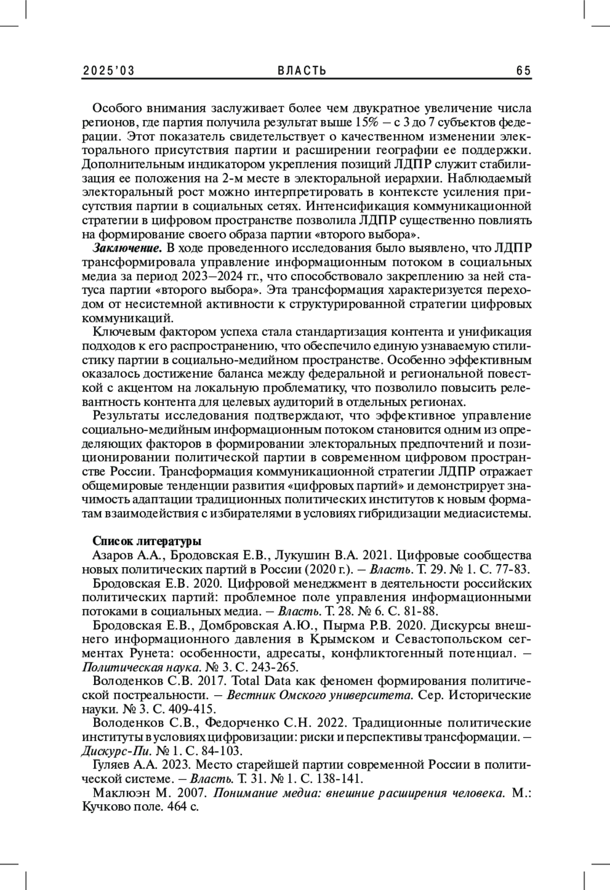 2. Бродовская Е.В. 2020. Цифровой менеджмент в деятельности российских политических партий: проблемное поле управления информационными потоками в социальных медиа. - Власть. Т. 28. № 6. С. 81-88. EDN: XVFRBA
