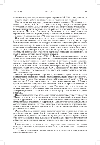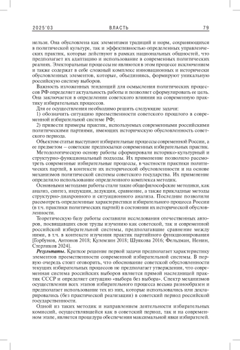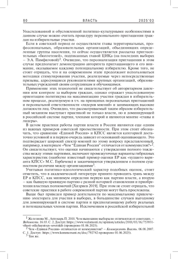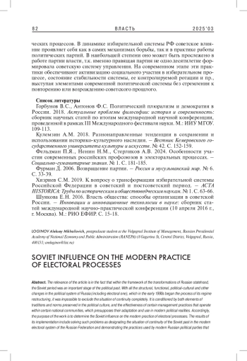 Актуальность статьи обусловлена тем, что в рамках трансформаций российской государственности важным этапом политического прошлого выступал советский период. При всех структурных, функциональных, политико-культурных и других изменениях политической системы России (включая избирательную), которая в начале 1990-х гг. начала процесс своей режимной перестройки, полностью исключить ситуацию преемственности было нельзя. Она обусловлена как элементами традиций и норм, сохраняющихся в политической культуре, так и эффективностью определенных управленческих практик, которые действуют в рамках определенных национальных общностей, что предполагает их адаптацию и использование в современных политических реалиях. Соответственно, цель работы заключается в определении советского влияния на современную практику избирательных процессов. Результаты ее осуществления включают решение таких задач, как обозначение ситуации преемственности советского прошлого в современной избирательной системе РФ и демонстрация практик, используемых современными российскими политическими партиями, имеющих историческую обусловленность советского периода. Методологическую основу работы сформировали историко-культурный и структурно-функциональный подходы.