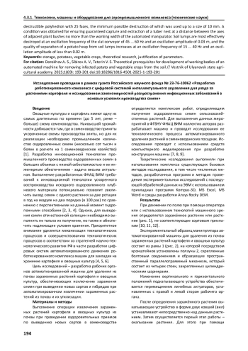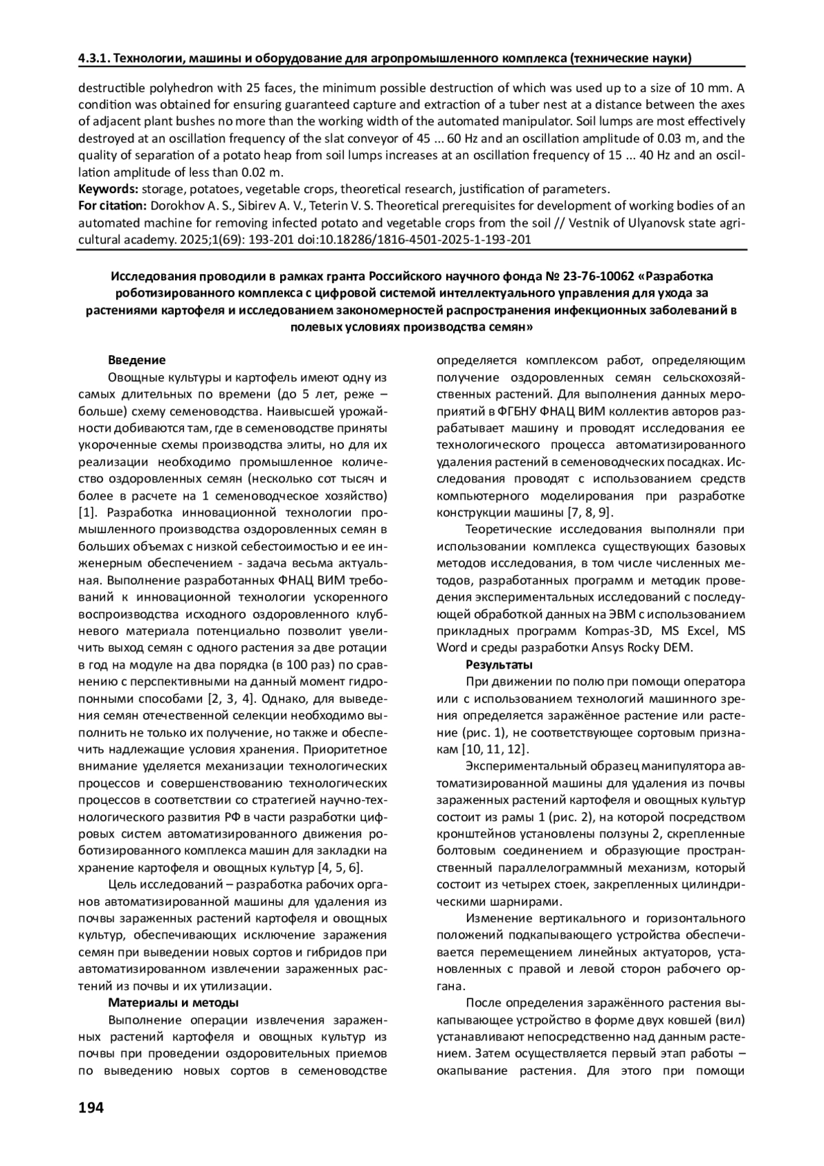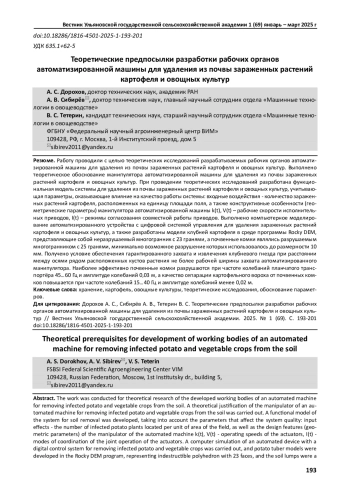 Статья: ТЕОРЕТИЧЕСКИЕ ПРЕДПОСЫЛКИ РАЗРАБОТКИ РАБОЧИХ ОРГАНОВ АВТОМАТИЗИРОВАННОЙ МАШИНЫ ДЛЯ УДАЛЕНИЯ ИЗ ПОЧВЫ ЗАРАЖЕННЫХ РАСТЕНИЙ КАРТОФЕЛЯ И ОВОЩНЫХ КУЛЬТУР (2025)