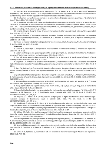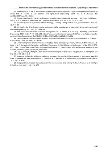 Работу проводили с целью теоретических исследований разрабатываемых рабочих органов автоматизированной машины для удаления из почвы зараженных растений картофеля и овощных культур. Выполнено теоретическое обоснование манипулятора автоматизированной машины для удаления из почвы зараженных растений картофеля и овощных культур. При проведении теоретических исследований разработана функциональная модель системы для удаления из почвы зараженных растений картофеля и овощных культур, учитывающая параметры, оказывающие влияние на качество работы системы: входные воздействия - количество зараженных растений картофеля, расположенных на единицу площади поля, а также конструктивные особенности (геометрические параметры) манипулятора автоматизированной машины k(t), V(t) - рабочие скорости исполнительных приводов, I(t) - режимы согласования совместной работы приводов. Выполнено компьютерное моделирование автоматизированного устройства с цифровой системой управления для удаления зараженных растений картофеля и овощных культур, а также разработаны модели клубней картофеля в среде программы Rocky DEM, представляющие собой неразрушаемый многогранник с 23 гранями, а почвенные комки являлись разрушаемым многогранником с 25 гранями, минимально возможное разрушение которых использовалось до размерности 10 мм. Получено условие обеспечения гарантированного захвата и извлечения клубневого гнезда при расстоянии между осями рядом расположенных кустов растения не более рабочей ширины захвата автоматизированного манипулятора. Наиболее эффективно почвенные комки разрушаются при частоте колебаний планчатого транспортёра 45…60 Гц и амплитуде колебаний 0,03 м, а качество сепарации картофельного вороха от почвенных комков повышается при частоте колебаний 15.40 Гц и амплитуде колебаний менее 0,02 м.