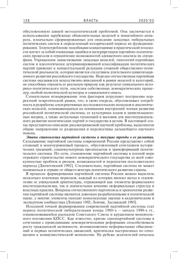 Статья посвящена анализу современной партийной системы России, рассматриваемой как уникальное политико-институциональное образование, не поддающееся традиционным классификациям, разработанным и адаптированным преимущественно для западных государств. Авторы выявляют основные этапы становления российской партийной системы, акцентируя внимание на переходе от фрагментарной и нестабильной к более консолидированной и функциональной модели. Авторы предлагают альтернативную схему анализа партий на основе их ресурсного потенциала и политико-правового статуса, критически рассматривают традиционную «лево-правую» шкалу и иные линейные модели описания современных партийных систем как методологически несостоятельные. Статья обосновывает необходимость разработки оригинальных научных и аналитических подходов, отражающих специфику российского политического ландшафта и новые формы политической мобилизации, представительства и конкуренции в условиях современного постиндустриального и цифрового общества.