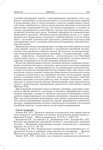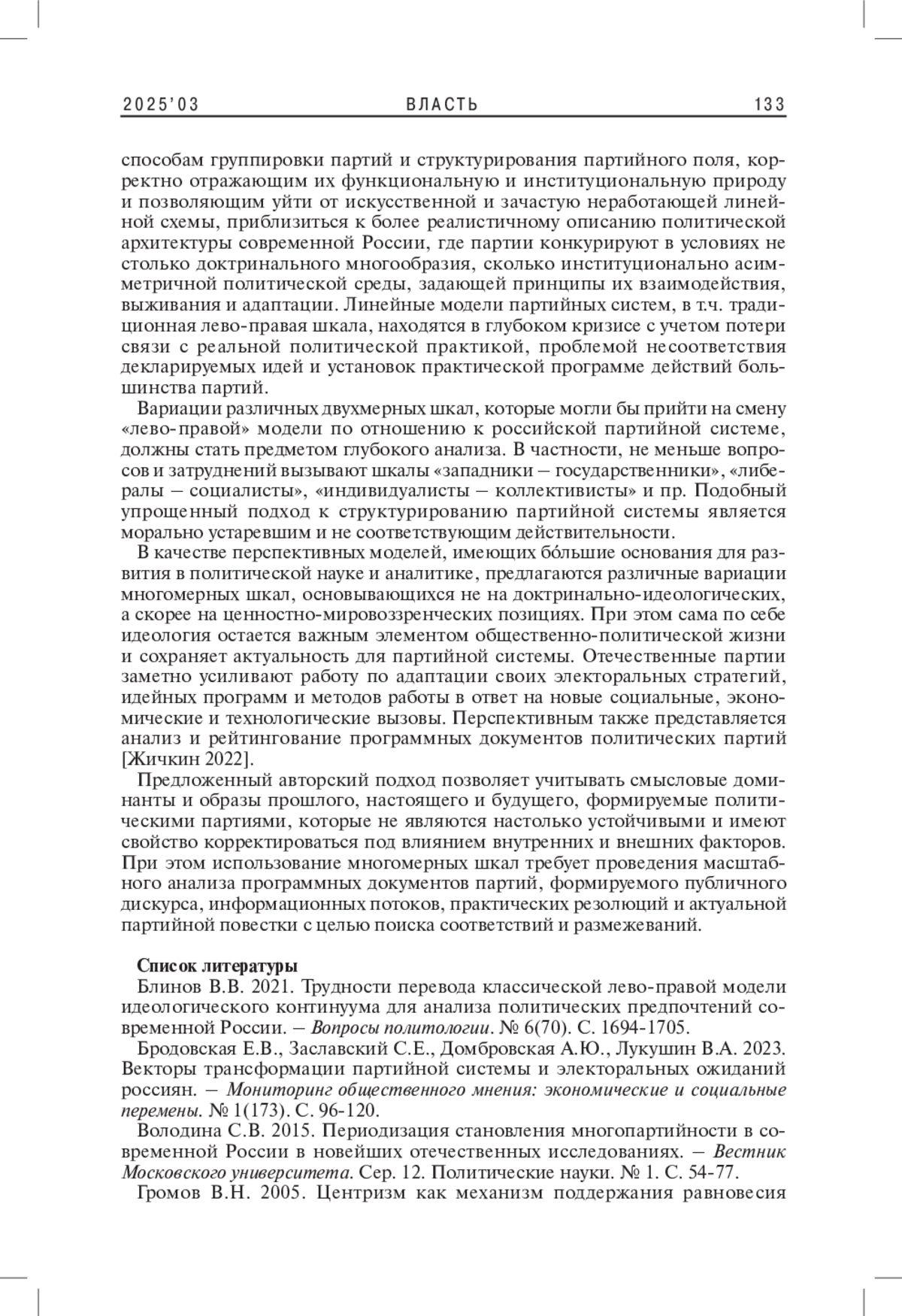 1. Блинов В.В. 2021. Трудности перевода классической лево-правой модели идеологического континуума для анализа политических предпочтений современной России. - Вопросы политологии. № 6(70). С. 1694-1705. EDN: ILHQEA