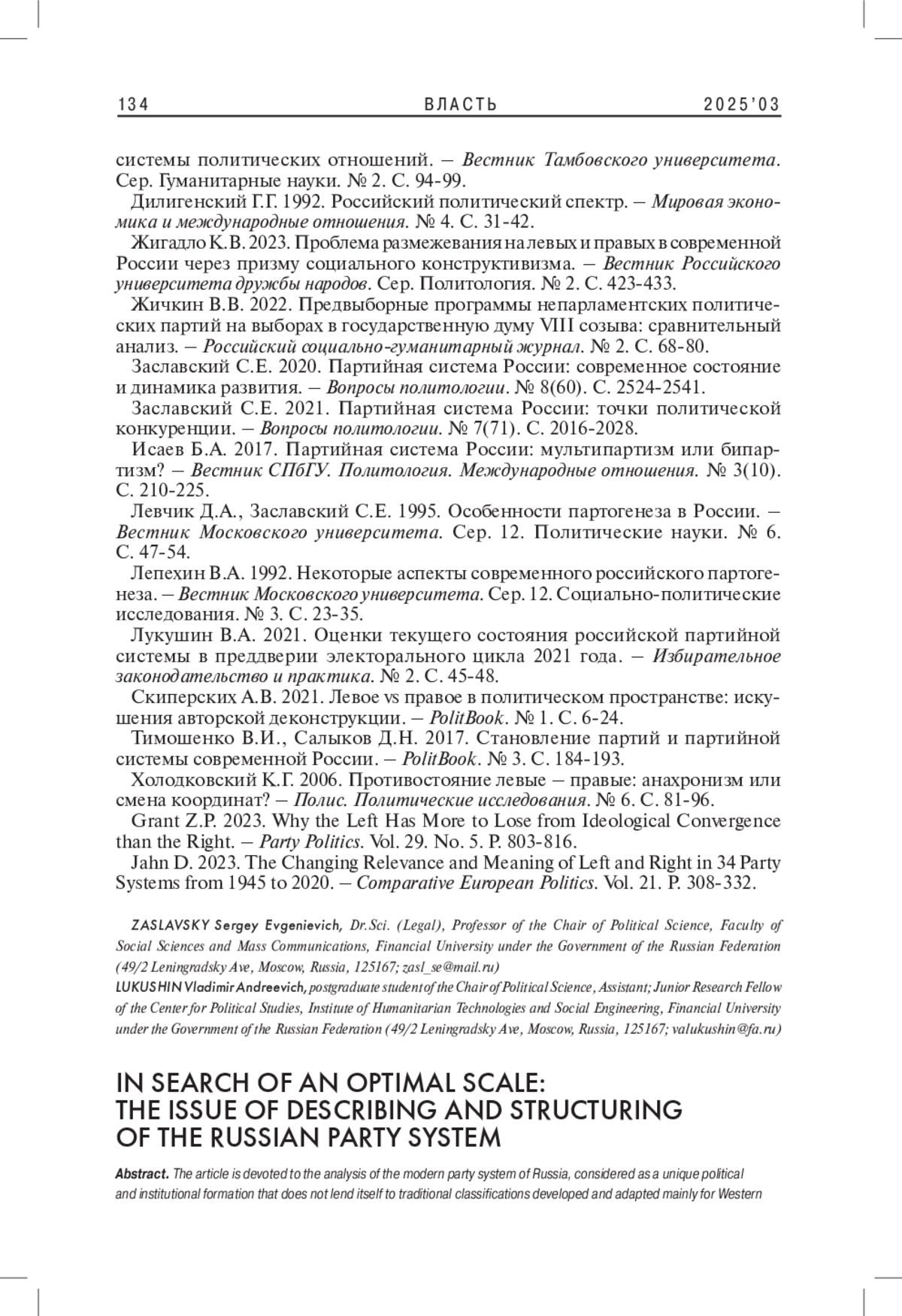 8. Заславский С.Е. 2020. Партийная система России: современное состояние и динамика развития. - Вопросы политологии. № 8(60). С. 2524-2541. EDN: DXTMZW