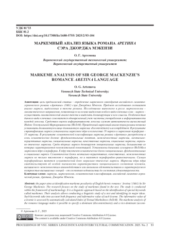 Цель предлагаемой статьи - определение маркемного своеобразия английского галантногероического романа «Аретина» (1661) сэра Джорджа Мэкензи. Предмет исследования составляет анализ маркем, выделенных в тексте романа. Исследование выполнено в русле маркемологии - лингвистического направления, позволяющего на основе выделения особого вида ключевых слов - маркем -осуществить лингвистический анализ текста и выделить доминирующие в нем смыслы. Особенностью данного вида ключевых слов является одновременный учет частоты употребления и информативности каждой лексемы. Средством оценки информативности лексемы служит автоматически вычисляемый Индекс Текстуальной Маркированности (ИнТеМ). Проведенный маркемный анализ языкаромана позволил установить доминантную и вице-доминантную маркемы: discontent(ment) и accomplishment. В результате стратификации маркем установлены маркемное ядро в количестве 19 маркем и маркемная периферия -33 маркемы. В результате семантической классификации маркемы романа «Аретина» распределены в семь семантических блоков: фундаментальные понятия, межличностные маркемы, ментальноперцептивные маркемы, эмоциональные маркемы, качественные маркемы, социальные маркемы, морально-этические маркемы. Среди ядерных маркем доминируют эмоциональные маркемы, большинство из которых характеризуется положительной коннотацией. Установлена динамика суммарного ИнТеМа в маркемном ядре и периферии. К ядру тяготеют семантические блоки эмоциональных, фундаментальных и социальных маркем. Семантические блоки ментально-перцептивных, качественных, межличностных маркем не только тяготеют к периферии, но и являются периферийно-равнозначными. Самым периферийным является семантический блок морально-этических маркем. Маркемы ядра ядра свидетельствуют об особой значимости характеристики эмоционального состояния человека, вызываемого межличностным взаимодействием или внешними обстоятельствами и характеризуемого полярностью вызываемых эмоций - от состояния недовольства до состояния удовлетворенности.