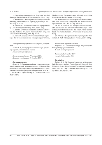 1. Bichlmeier Н. Analyse und Bewertung der sprachwissenschaftlichen Standards aktueller Forschungen traditioneller Art zur “alteuropaischen Hydronymie” aus der Perspektive der heutigen Indogermanistik // Namenkundliche Informationen. 2012/2013. Bd. 101/101. S. 397-438.