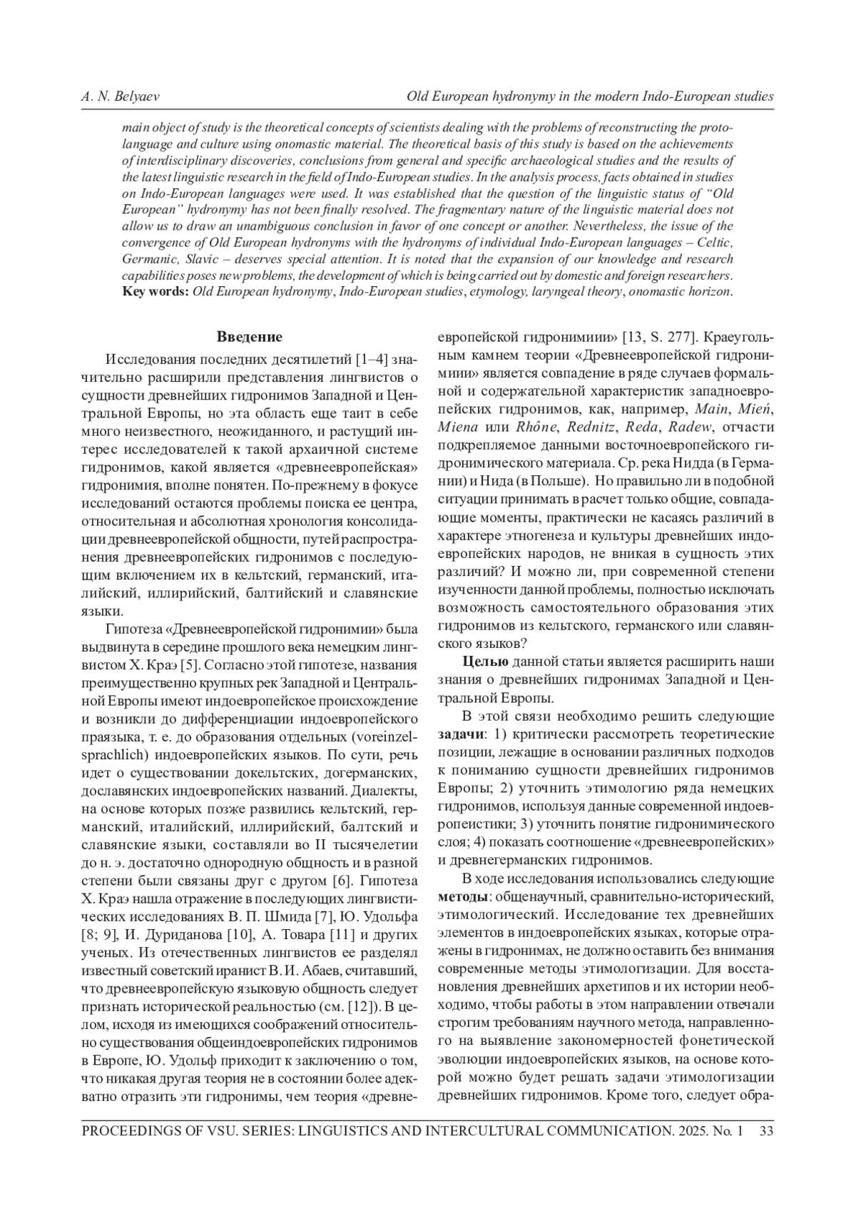Предметом исследования в настоящей статье являются названия крупных рек в Западной и Центральной Европе. В этом контексте прежде всего упоминается Х. Краэ, который в 1950-х гг. прошлого столетия создал теорию «Древнеевропейская гидронимия». В статье критически рассматривается теоретическая концепция Х. Краэ, изложенная в ряде его трудов и явившаяся базой для лингвистической интерпретации «древнеевропейской» гидронимии. Критически рассматриваются также некоторые работы его учеников и единомышленников. Отмечается, что объективная необходимость в освещении теоретических оснований «древнеевропейской» гидронимии созрела давно. Прежде всего это касается этимологии некоторых названий рек. Обращается внимание на общетеоретические положения современной индоевропеистики, образующие единую концепцию реконструкции праязыковой ситуации в Западной и Центральной Европе. Главным объектом изучения являются теоретические концепции ученых, занимающихся проблемами реконструкции праязыка и культуры с использованием ономастического материала. Теоретическую основу настоящего исследования составляют использование достижений, связанных с междисциплинарными открытиями, выводы из общих и частных археологических исследований и результаты новейших лингвистических исследований в области индоевропеистики. В процессе анализа использовались факты, полученные в исследованиях по индоевропейским языкам. В результате проведенного анализа установлено, что вопрос о лингвистическом статусе «древнеевропейской» гидронимии окончательно не решен. Фрагментарность языкового материала не позволяет сделать однозначный вывод в пользу той или иной концепции. Тем не менее заслуживает особого внимания вопрос сближения древнеевропейских гидронимов с гидронимами отдельных индоевропейских языков - кельтским, германским, славянским. Отмечается, что расширение наших знаний и исследовательских возможностей ставит новые проблемы, разработка которых ведется отечественными и зарубежными исследователями.
