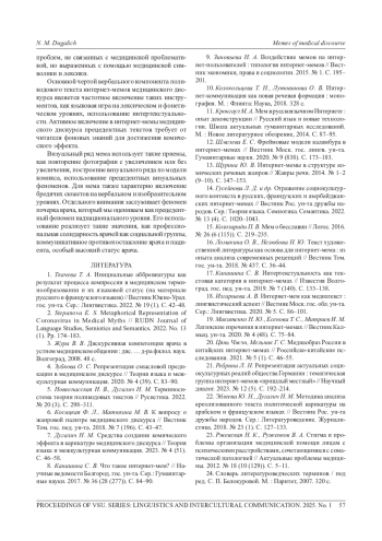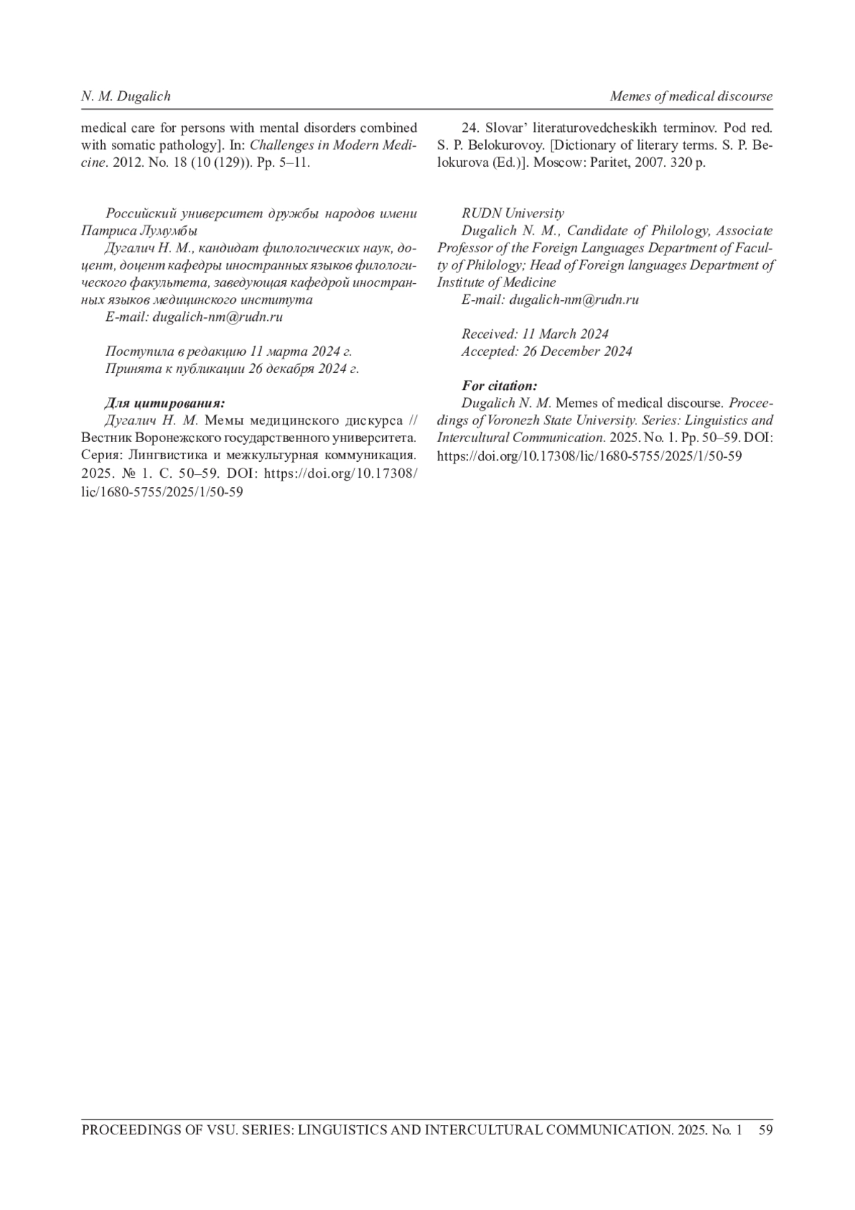 ДУГАЛИЧ Н. М. МЕМЫ МЕДИЦИНСКОГО ДИСКУРСА // ВЕСТНИК ВОРОНЕЖСКОГО ГОСУДАРСТВЕННОГО УНИВЕРСИТЕТА. СЕРИЯ: ЛИНГВИСТИКА И МЕЖКУЛЬТУРНАЯ КОММУНИКАЦИЯ. 2025. № 1