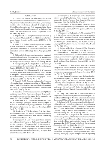 Поликодовые юмористические жанры привлекают внимание читателя и исследователей прежде всего своим вирусным характером, созависимостью вербальной и визуальной части, наличием прецедентного ряда, что требует пресуппозиционной базы у читателя для достижения комического эффекта. Проведенное исследование выполнено на материале 200 текстов интернет-мемов на русском языке, содержащих медицинскую лексику, визуальные образы врача и пациента, медицинских инструментов и помещений. Новизна предлагаемого исследования заключается в рассмотрении особенностей мемов как поликодового жанра медицинского дискурса, выделении характерных признаков вербального и визуального рядов, впервые отмечены бродячие сюжеты науровне текста и изображения. Институциональный медицинский дискурс остается актуальной темой исследования современной лингвистики, поскольку у исследователя присутствует вовлеченность в коммуникацию врач - пациент и отсутствует представление о завершенности лингвистического описания данной коммуникации ввиду постоянного обновления текстов, содержащих медицинскую тематику, лексику, а также визуального ряда, содержащего медицинскую символику. Исследование показало разнообразие тематики интернет-мемов данной группы: обсуждение компетенций врача, особенности платного и бесплатного лечения, обучение в медицинскихуниверситетах, морально-этические аспекты деятельности врача, а также немедицинские социальные проблемы, выраженные с помощью медицинской символики и лексики. Частотными также являются мемы, посвященные обсуждению социальной значимости профессии врача. Вербальный ряд поликодового текста медицинского интернет-мема включает языковую игру на лексическом и фонетическом уровнях, прецедентные тексты, термины. Изобразительный ряд содержит прецедентные образы, используется повторение фотографии с увеличением или без увеличения, построение визуального ряда по модели комикса.