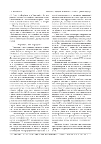 Статья посвящена анализу функций топонимов в испанских медиатекстах. В ней приведены результаты исследования, целью которого было выявить функции, реализуемые топонимами в зависимости от их использования как средства первичной номинации для референции к традиционному реальному денотату (географическому объекту) или как средства вторичной номинации (применительно к единичному или коллективному субъекту на основе метонимических или метафорических переносов). Анализ функционирования топонимов в новостных публикациях из четырех рубрик выявил высокую топонимическую насыщенность испанских медиатекстов. Наиболее частотные классы топонимов демонстрируют более высокий номинативный потенциал и максимальное количество переносов, универсальной является метонимическая формула: «место - жители». Были выделены основные и дополнительные функции топонимов в медиатекстах. К основным функциям относятся адресная или идентифицирующая: при употреблении топонима в прямом значении и в зависимости от формы представления в тексте (самостоятельно, в составе апеллятивно-топотнимического комплекса или с конкретизаторами) реализуется или одна, или другая функция. При употреблении топонима в переносном значении также реализуется идентифицирующая функция. К дополнительным функциям относятся аттрактивная, идеологическая, функция переключения параметров хронотопа, оценочно-характеризующая, текстоорганизующая. Идеологическая функция получает новую трактовку. Текстоорганизующая функция топонимов выделяется впервые применительно к данному классу лексических единиц. При анализе языкового материала применялись описательный метод, метод количественного анализа, метод лексикосемантического и контекстуального анализа, функциональный подход.