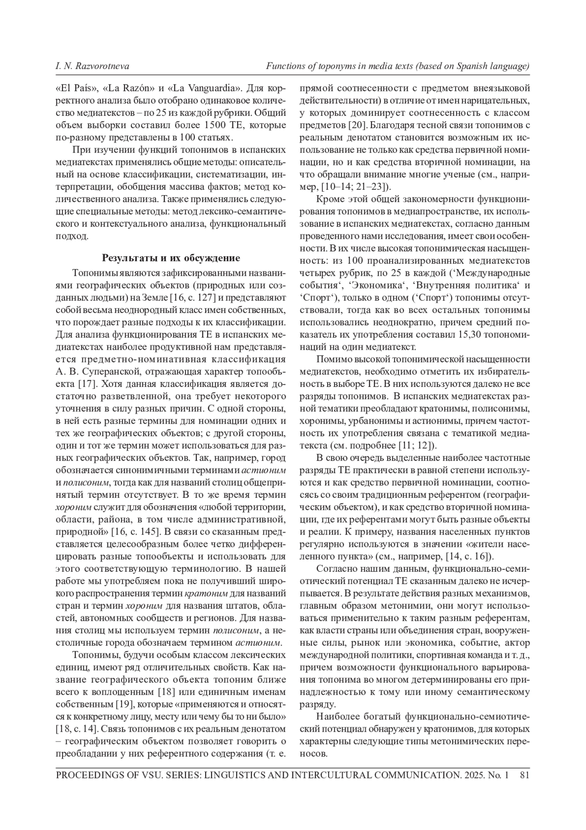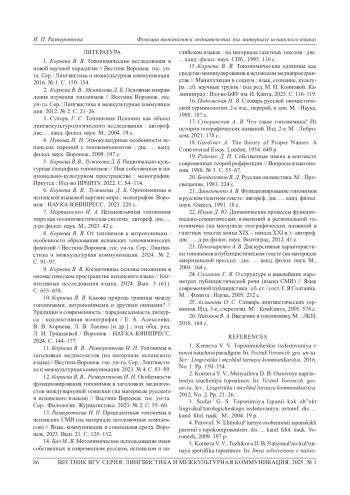 РАЗВОРОТНЕВА И.Н. ФУНКЦИИ ТОПОНИМОВ В МЕДИАТЕКСТАХ (НА МАТЕРИАЛЕ ИСПАНСКОГО ЯЗЫКА) // ВЕСТНИК ВОРОНЕЖСКОГО ГОСУДАРСТВЕННОГО УНИВЕРСИТЕТА. СЕРИЯ: ЛИНГВИСТИКА И МЕЖКУЛЬТУРНАЯ КОММУНИКАЦИЯ. 2025. № 1