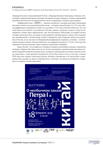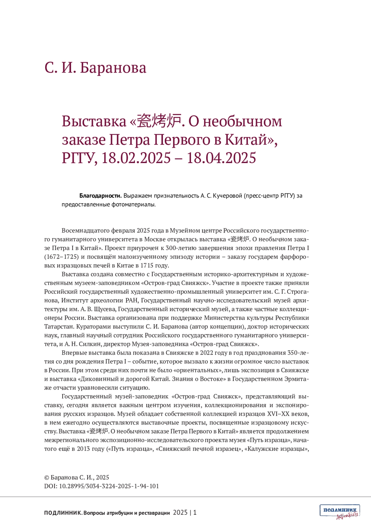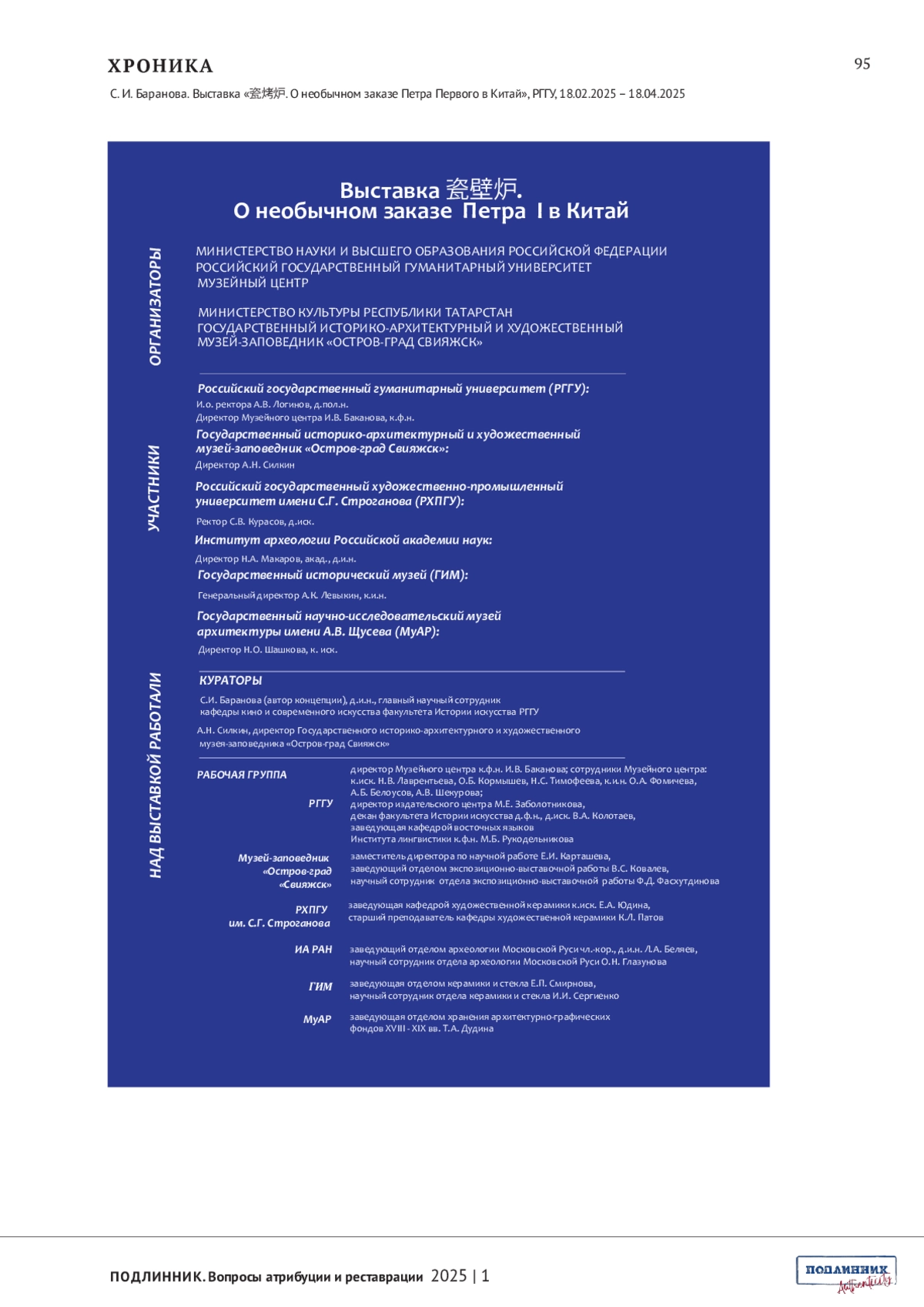БАРАНОВА С. И. ВЫСТАВКА «瓷烤炉. О НЕОБЫЧНОМ ЗАКАЗЕ ПЕТРА ПЕРВОГО В КИТАЙ», РГГУ, 18.02.2025 - 18.04.2025 // ПОДЛИННИК. ВОПРОСЫ АТРИБУЦИИ И РЕСТАВРАЦИИ. 2025. № 1 (5)