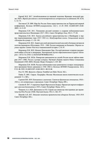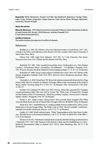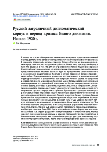 В статье на основе обширного источникового материала представлен сложный период деятельности Заграничного дипломатического корпуса Белого движения. В условиях поражений, которые терпели белые в России, их внешнеполитическое представительство продолжало работать. Более того, руководство Корпуса приняло решение о том, что для его учреждений не только подчинение органам Советской власти невозможно, но недопустима и передача дел дипломатическим представительствам Москвы. Был взят курс на продолжение самостоятельного и независимого существования Корпуса в случае поражения белых в Гражданской войне. Предпринимались усилия по восстановлению в дипломатической структуре иерархии и дисциплины. Был сокращён личный состав, но сохранена репрезентативность учреждений Корпуса в мире. Велась работа по обеспечению финансирования его дальнейшей деятельности. Ведомство продолжало повседневную работу, в которой выделились и усиливались новые направления. Оно активно оказывало помощь растущему количеству русских беженцев, искало пути сохранения русского имущества за рубежом. Руководство структуры начало разрабатывать вопрос о правовой защите покинувших родину соотечественников на случай поражения Белого движения. Приход к власти в Крыму генерала барона Врангеля был неоднозначно встречен русским обществом за рубежом. Возглавлявший дипломатическое ведомство с января 1919 г. С. Д. Сазонов проявил полную лояльность по отношению к созданному в Севастополе правительству. Тем не менее Врангель отправил его в отставку, передав управление внешней политикой П. Б. Струве. Однако С. Д. Сазонов успел подготовить позиции для старейшины Корпуса – посла в Риме М. Н. Гирса, который и возглавил Корпус после отставки Сазонова. П. Б. Струве разделил с ним руководство и ответственность. Корпус укрепил свои независимые позиции и вошёл в последний этап противостояния с большевиками как партнёр, а не подчинённая центру структура, что дало ему перспективу продолжения работы после окончания Гражданской войны на Родине.