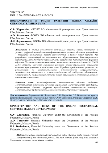 Актуальность исследования возможностей и рисков онлайн-обучения обусловлена стремительной цифровой трансформацией образовательного процесса. По данным исследования EdTech-рынка России, к началу 2024 года более 85% образовательных учреждений внедрили элементы онлайн-обучения в свои программы [3, с. 156]. Глобальный рынок онлайн-образования, согласно отчету World Economic Forum, демонстрирует ежегодный рост на 16,5%, и к 2025 году его объем достигнет 350 млрд долларов [9, с. 125].