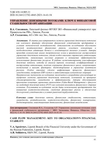 В статье рассматривается система управления денежными потоками как ключевого фактора обеспечения финансовой устойчивости предприятия в условиях экономической нестабильности. Актуальность исследования обусловлена высокой волатильностью финансовых рынков, усилением конкуренции и необходимостью адаптации бизнеса к изменяющимся внешним условиям. Авторы проводят комплексный анализ теоретических основ и практических инструментов управления денежными потоками, уделяя особое внимание стратегиям оптимизации ликвидности, минимизации кассовых разрывов и повышения эффективности использования финансовых ресурсов. В работе систематизированы классификации денежных потоков, методы их анализа (прямой, косвенный, коэффициентный) и инструменты оптимизации, включая сокращение финансового цикла, синхронизацию поступлений и выплат, факторинг, бюджетирование и управление валютными рисками. Особое внимание уделено цифровизации процессов финансового менеджмента, внедрению ERP-систем и автоматизации казначейских операций.