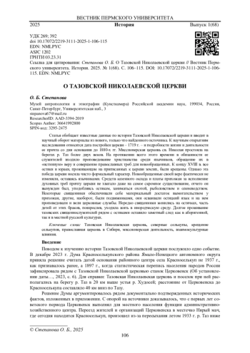 СТЕПАНОВА О. Б. О ТАЗОВСКОЙ НИКОЛАЕВСКОЙ ЦЕРКВИ // ВЕСТНИК ПЕРМСКОГО УНИВЕРСИТЕТА. ИСТОРИЯ. 2025. № 1 (68)