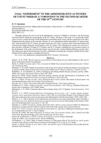СМЕТАНИН Д. В. УГОЛЬНЫЙ «ЭКСПЕРИМЕНТ» В АДМИНИСТРАТИВНОЙ ДЕЯТЕЛЬНОСТИ ГРАФА М. С. ВОРОНЦОВА ВО ВТОРОЙ ЧЕТВЕРТИ XIX ВЕКА // ВЕСТНИК ПЕРМСКОГО УНИВЕРСИТЕТА. ИСТОРИЯ. 2025. № 1 (68)