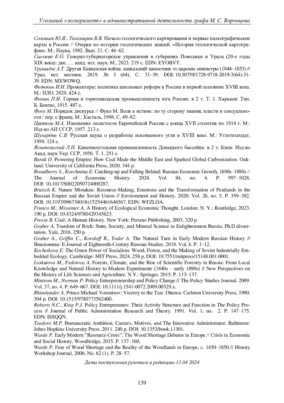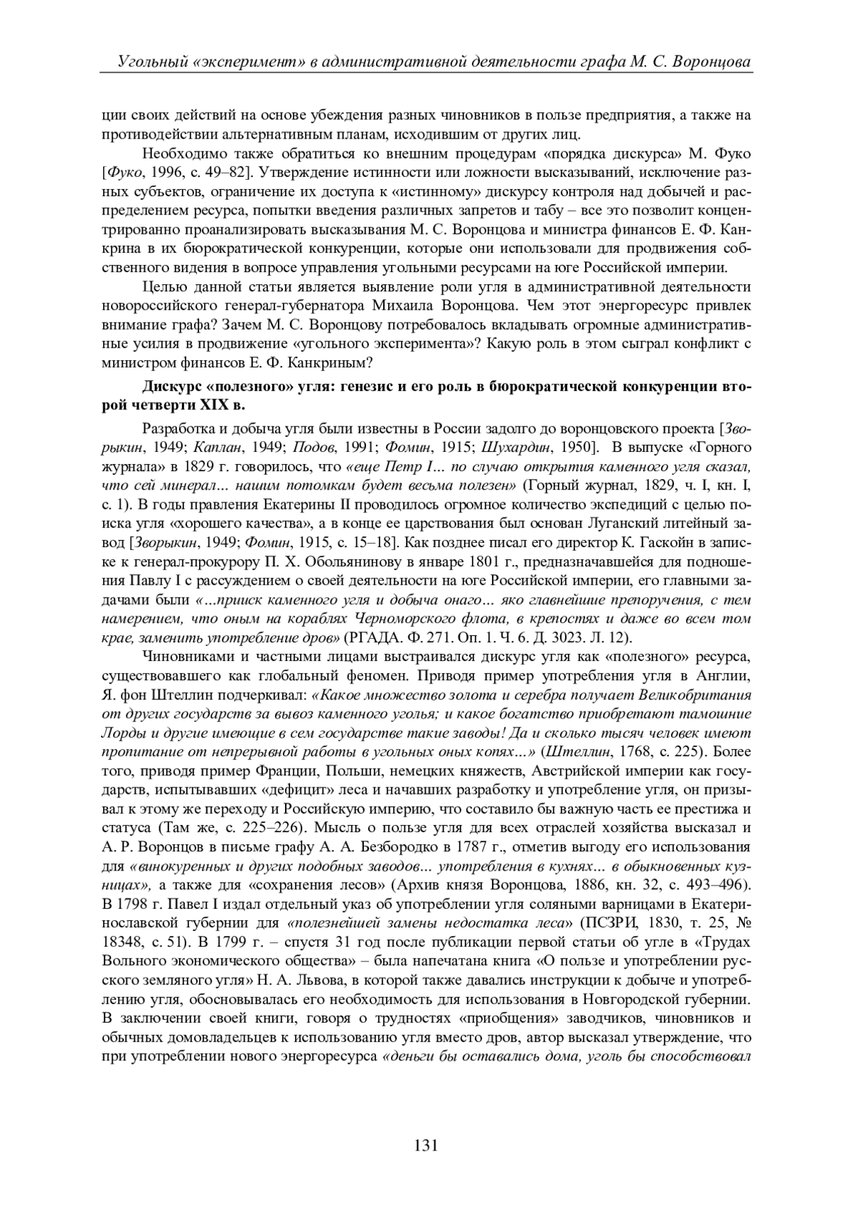 Статья: УГОЛЬНЫЙ «ЭКСПЕРИМЕНТ» В АДМИНИСТРАТИВНОЙ ДЕЯТЕЛЬНОСТИ ГРАФА М. С. ВОРОНЦОВА ВО ВТОРОЙ ЧЕТВЕРТИ XIX ВЕКА (2025)