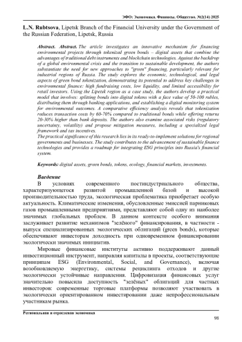 Статья посвящена исследованию инновационного механизма финансирования экологических проектов через токенизированные зеленые облигации – цифровые активы, объединяющие преимущества традиционных долговых инструментов и блокчейн-технологий. В условиях глобального экологического кризиса и перехода к устойчивому развитию авторы обосновывают необходимость новых подходов к “зеленому” финансированию, особенно актуальных для промышленных регионов России. Исследование раскрывает экономические, технологические и правовые аспекты токенизации зеленых облигаций, демонстрируя их потенциал для решения ключевых проблем экологического финансирования: высокой стоимости привлечения средств, низкой ликвидности и ограниченной доступности для розничных инвесторов. На примере Липецкой области разработана практическая модель, предполагающая: дробление облигаций на цифровые токены номиналом 50-100 рублей, их распространение через банковские приложения, создание системы цифрового мониторинга экологических результатов. Особое внимание уделено сравнительному анализу эффективности: токенизация сокращает транзакционные издержки на 60- 70% по сравнению с традиционными облигациями, обеспечивая доходность на 20-30% выше банковских вкладов. Авторы также рассматривают риски (правовая неопределенность, волатильность) и предлагают меры по их минимизации, включая специальный правовой режим и налоговые льготы.